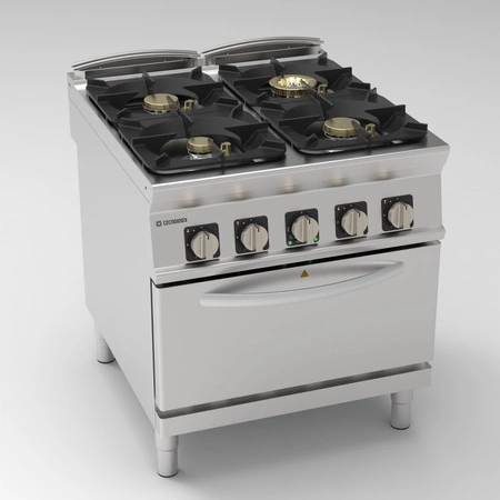 Każdy palnik gazowy posiada zabezpieczenie przeciwwypływowe gazu (termopara) oraz zapłon pilotowy, gwarantujące bezpieczną eksploatację. Komora piekarnika wykonana jest z wysokiej jakości stali nierdzewnej, zapewniającej łatwość utrzymania czystości. Regulowane nóżki (od 133 do 195 mm) pozwalają dopasować wysokość urządzenia do indywidualnych potrzeb.