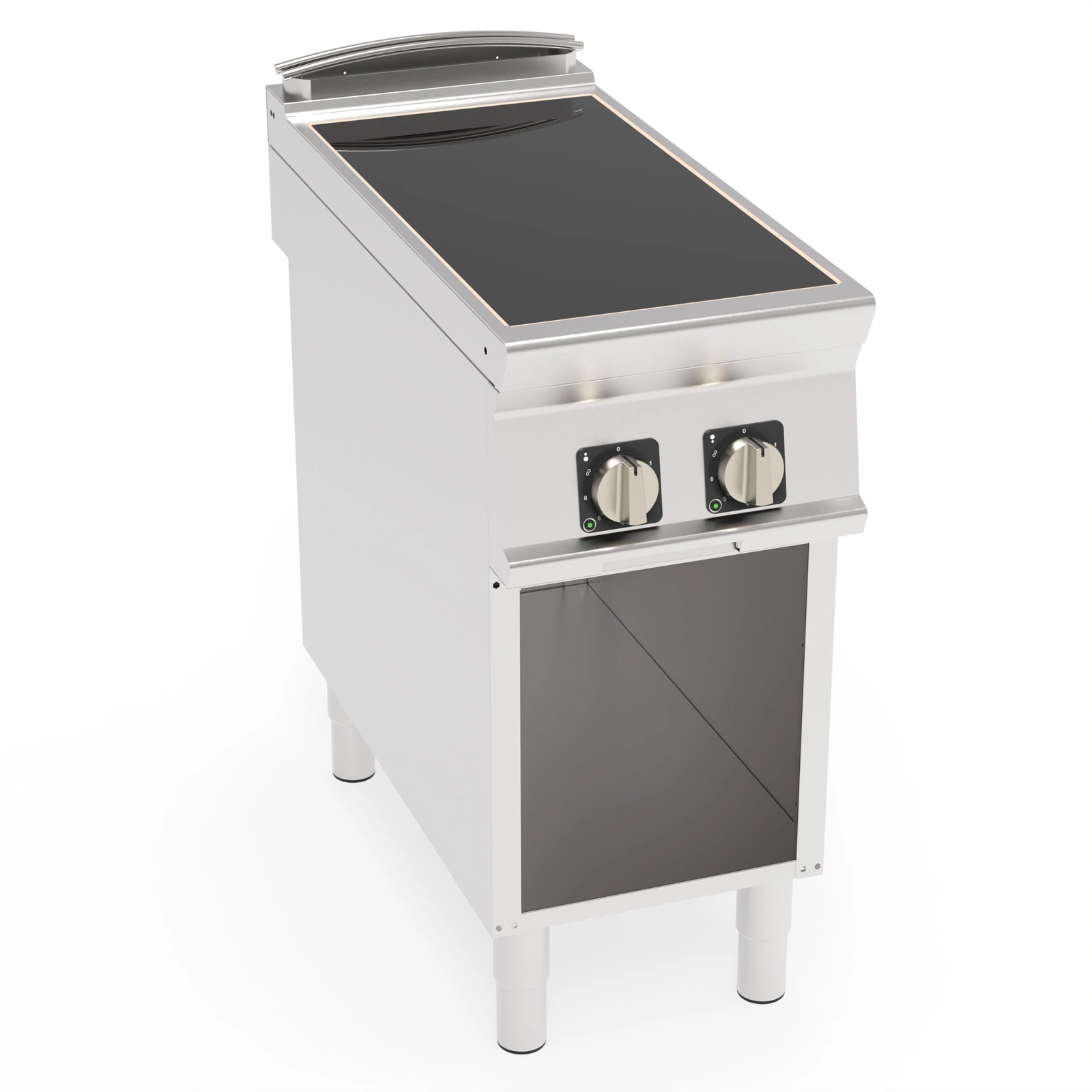 Solidna konstrukcja ze stali nierdzewnej AISI 304 oraz wytrzymała szklano-ceramiczna płyta grzewcza gwarantują trwałość, higienę i łatwość utrzymania w czystości. Otwarta podstawa stanowi dodatkową przestrzeń do przechowywania akcesoriów lub naczyń, co zwiększa funkcjonalność stanowiska pracy. Regulowane nóżki pozwalają na wygodne dopasowanie wysokości do potrzeb kuchni.