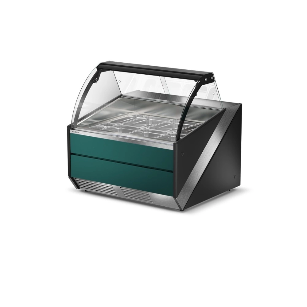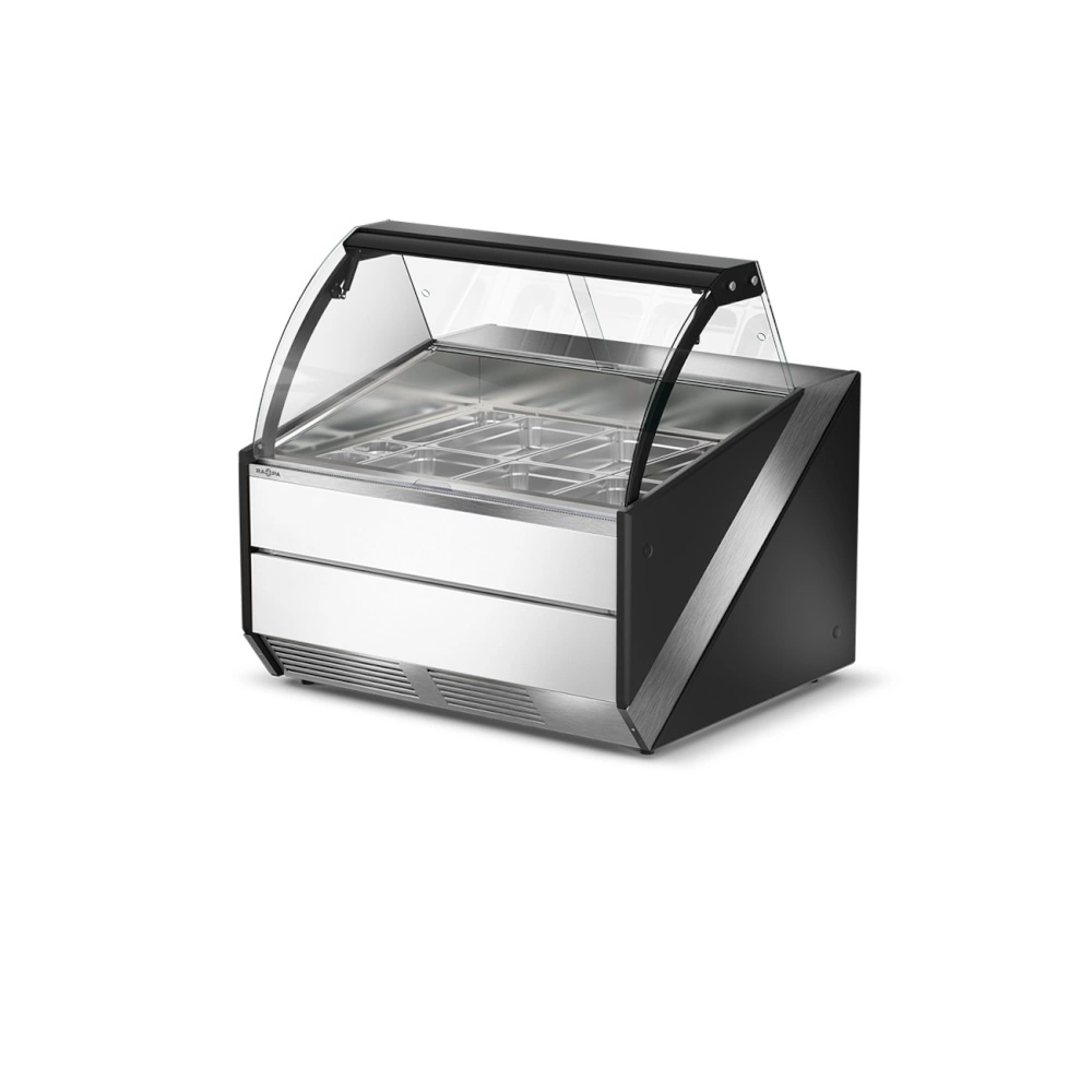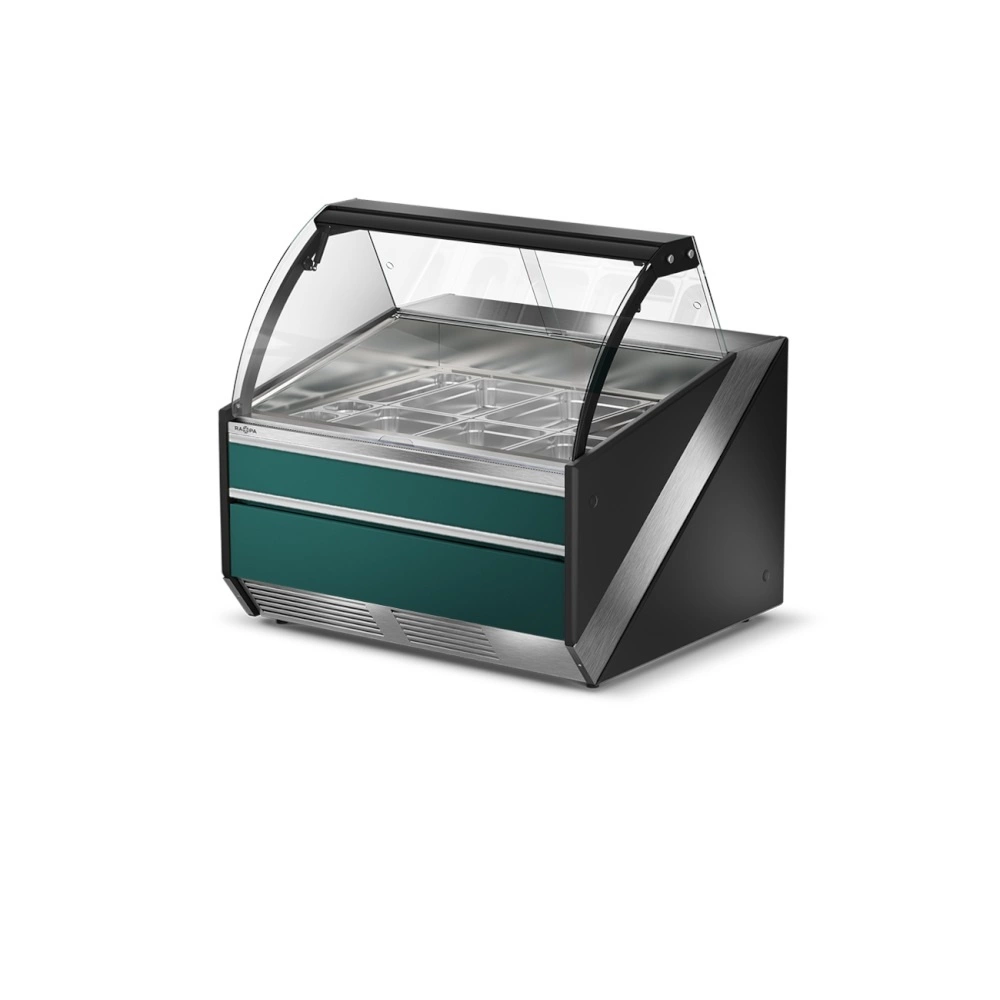 Lada grzewcza z szybą czołową giętą, otwieraną do góry L-S/DHBM o wymiarze 134.5x120x121 cm. Dostępna w wersji z półką frontową, odbojnikami nierdzewnymi lub w formie bez dodatków. Lada w stylistyce inoXframe z nierdzewnym blatem, bokami z tworzywa i izolacją poliuretanową. Lady grzewcze można łączyć w ciągi lub zestawiać je z innymi urządzeniami z linii SiX. W standardzie urządzenie jest wyposażone w 3 szt. prowadnic, a maksymalnie w ekspozycji można umieścić 6 sztuk, które można dokupić z oferty akcesoriów. Dzięki temu można w łatwy sposób dopasowywać wnętrze do bieżących potrzeb przesuwając prowadnice i układając pojemniki w różnych konfiguracjach.