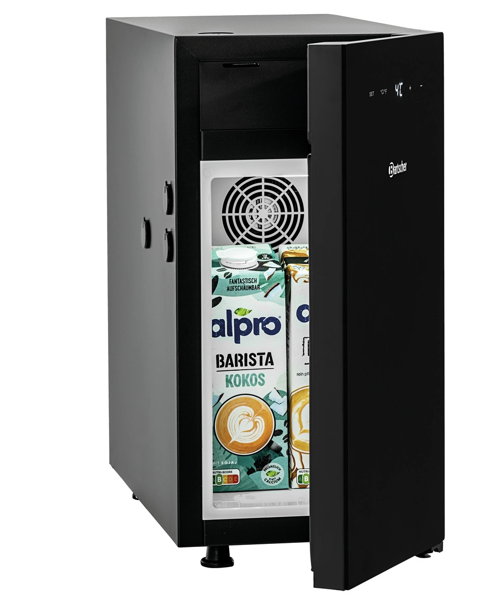 Lodówka na mleko BARTSCHER KV9L to doskonałe rozwiązanie dla kawiarni, restauracji oraz hoteli, które cenią świeżość mleka podczas przygotowywania kaw takich jak cappuccino, café au lait czy latte macchiato. Urządzenie zapewnia bezpośrednie podłączenie mleka do ekspresu poprzez boczne otwory, co umożliwia wygodne i higieniczne pobieranie schłodzonego mleka wprost do filiżanki.