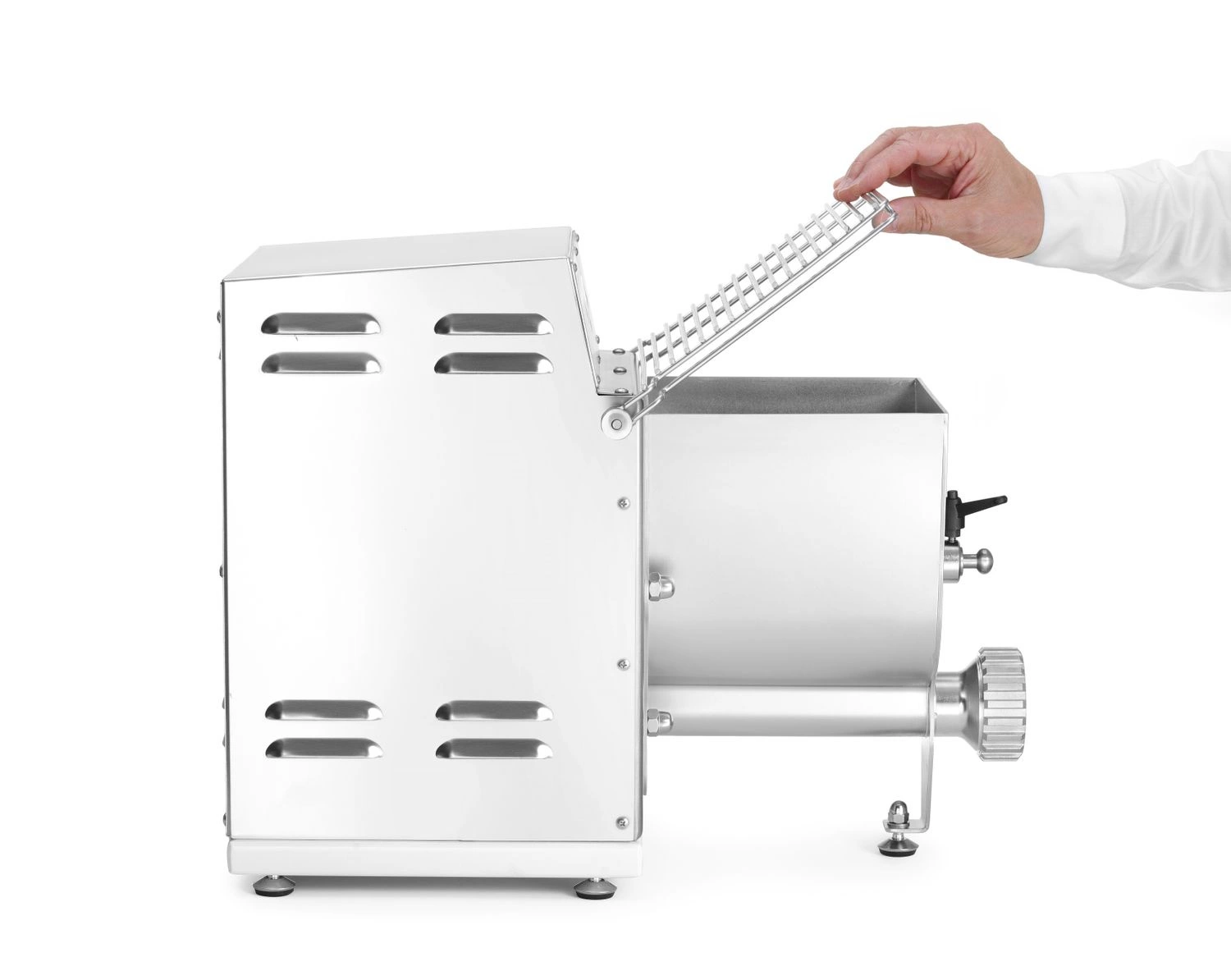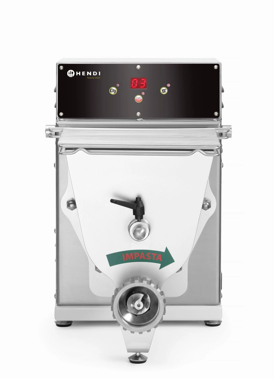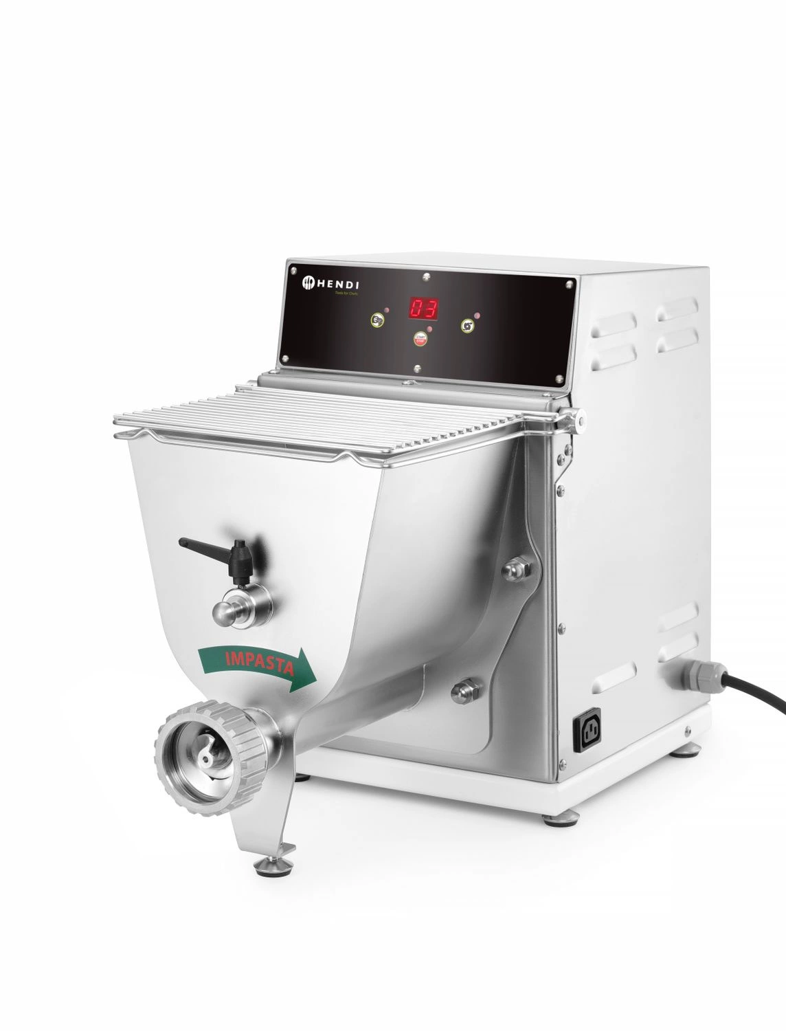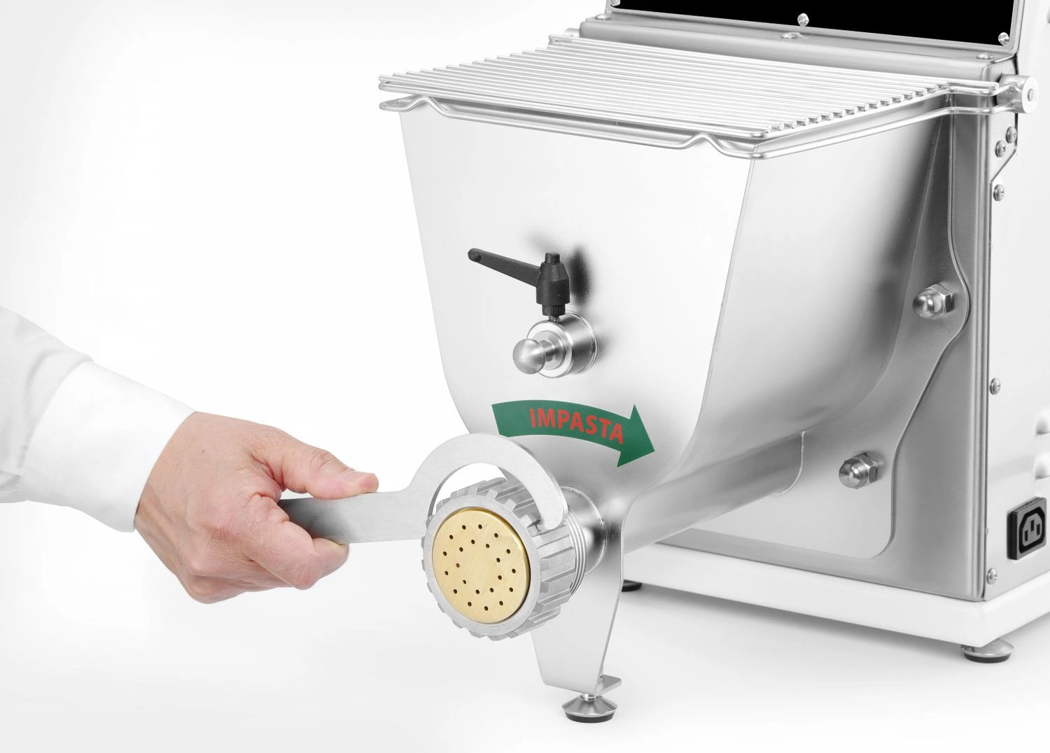 Maszyna do produkcji makaronu o wydajności 8 kg/h. Posiada dzieżę 2 kg (bez sita). Bez końcówek.