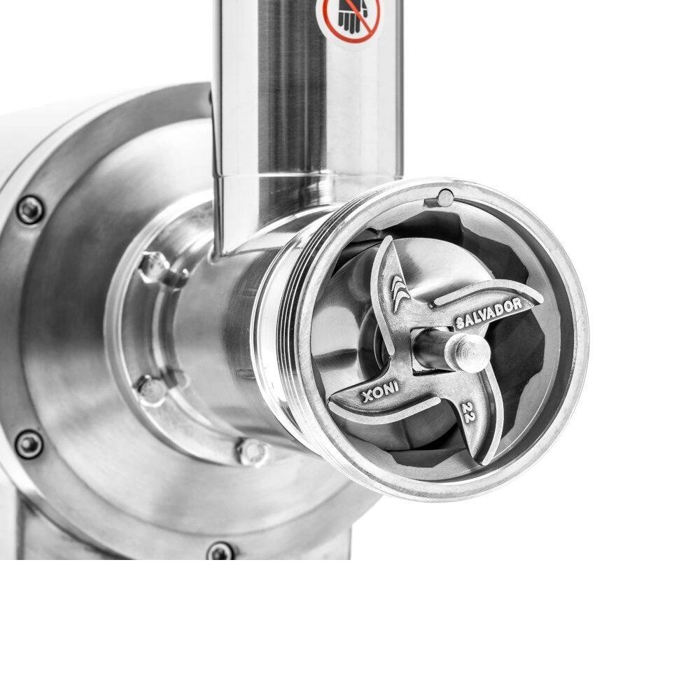 - Solidna konstrukcja: Obudowa wykonana jest z polerowanego aluminium, a gardziel z wytrzymałego odlewu żeliwa, co zapewnia trwałość i odporność na uszkodzenia mechaniczne. Elementy tnące, takie jak nóż i ślimak, wykonane są ze stali nierdzewnej, co gwarantuje łatwość czyszczenia i wysoką higienę pracy.