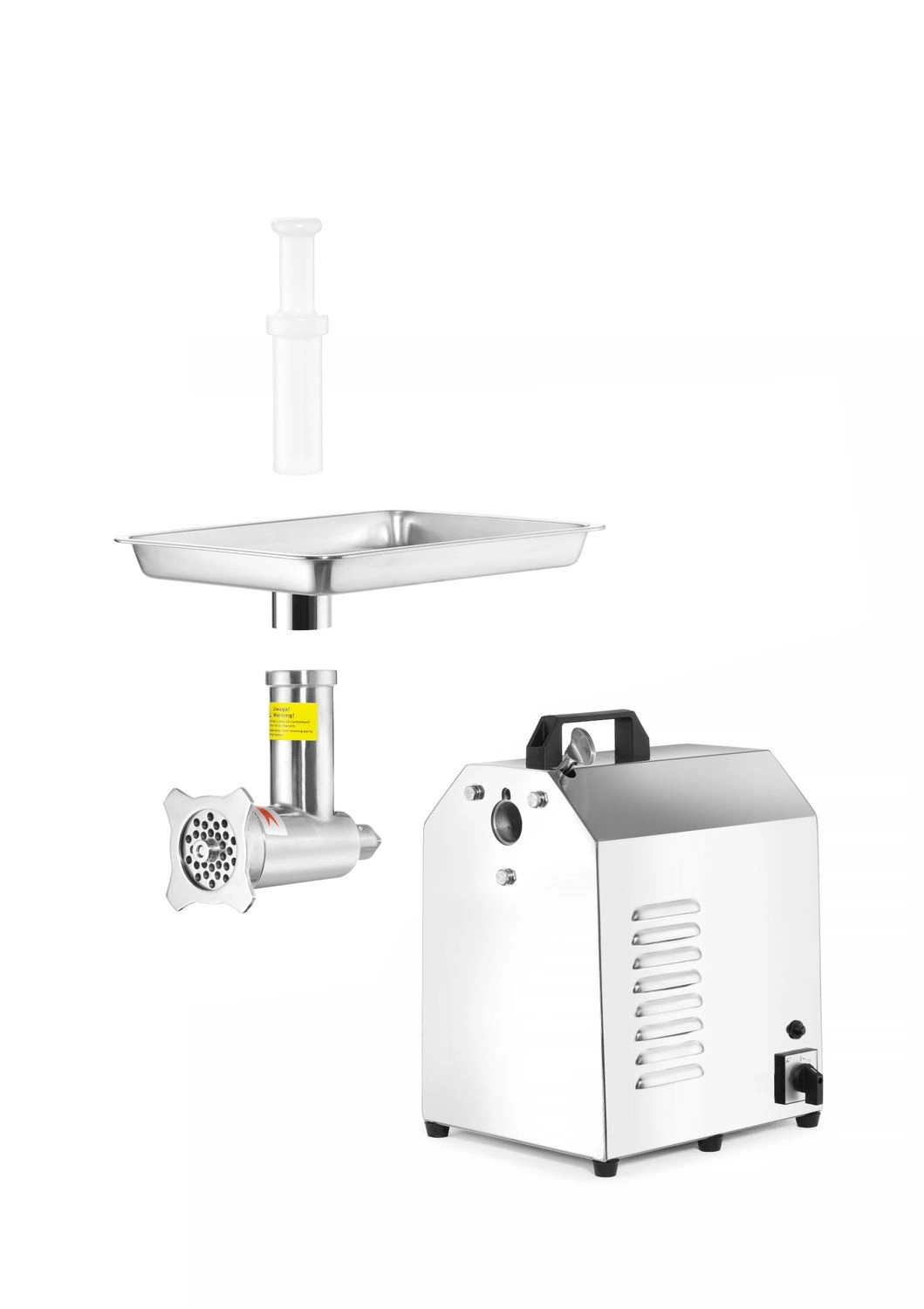 W zestawie z maszynką znajdują się dwa sitka o średnicy otworów 6 mm i 8 mm, wykonane ze stali nierdzewnej, a także nóż i ślimak również ze stali nierdzewnej. Dołączono także lejek do kiełbas z polipropylenu oraz kołek dociskowy z polietylenu, co zwiększa funkcjonalność urządzenia, umożliwiając nie tylko mielenie mięsa, ale także przygotowywanie wyrobów wędliniarskich.