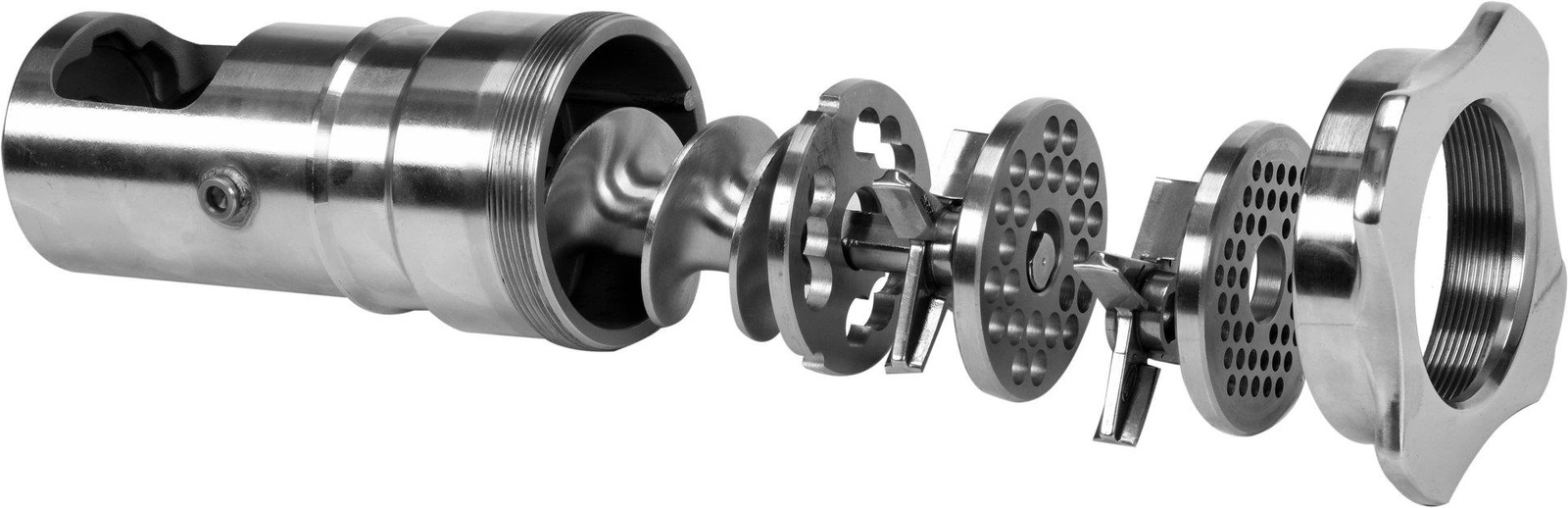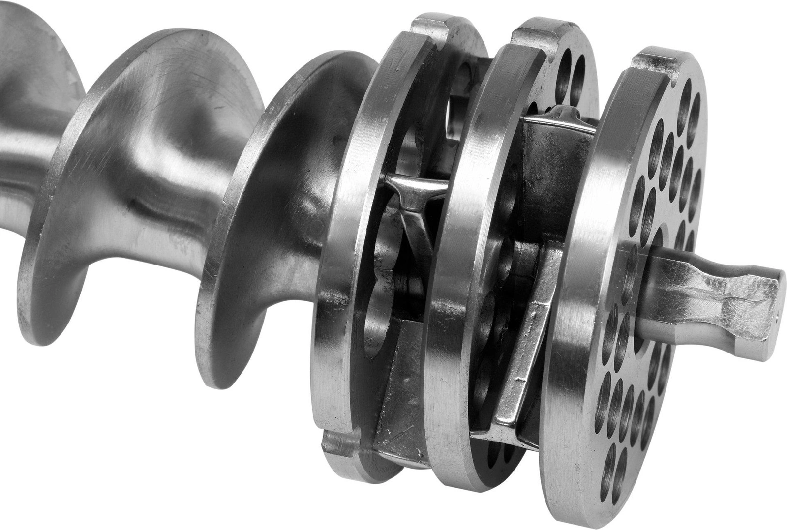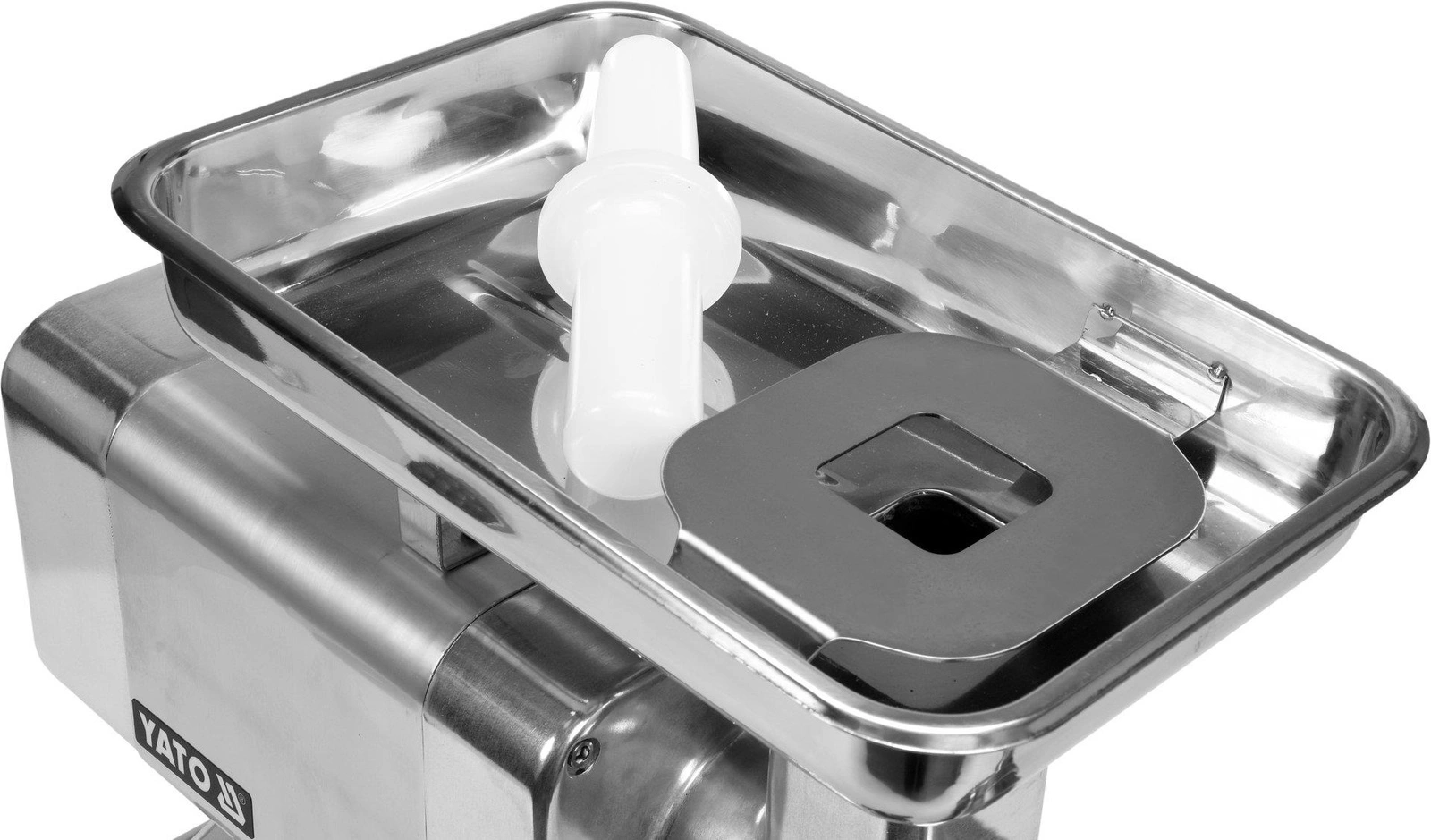 Profesjonalna maszynka do mielenia mięsa (wilk) z systemem UNGER marki YATO o orientacyjnej wydajności 220 kg/godz. Obudowawykonana z anodyzowanego aluminium. Wyjmowana gardziel. Nóż, ślimak, sitka oraz taca załadowcza wykonane ze stali nierdzewnej. System UNGER przydatny szczególnie do przygotowywania kiełbas i wędlin składa się z: szarpaka, dwustronnego noża tnącego 4-ramiennego oraz gardzieli o średnicy 8 cm. Napęd wilka posiada funkcję rewersu, ułatwiającą czyszczenie urządzenia po zakończonej pracy. Możliwość zdjęcia tacy załadowczej. Urządzenie posiada zabezpieczenie przeciw przeciążeniowe. W podstawie zostało zamontowane 6 gumowych nóżek, które zapobiegają przesuwaniu się urządzenia podczas pracy.