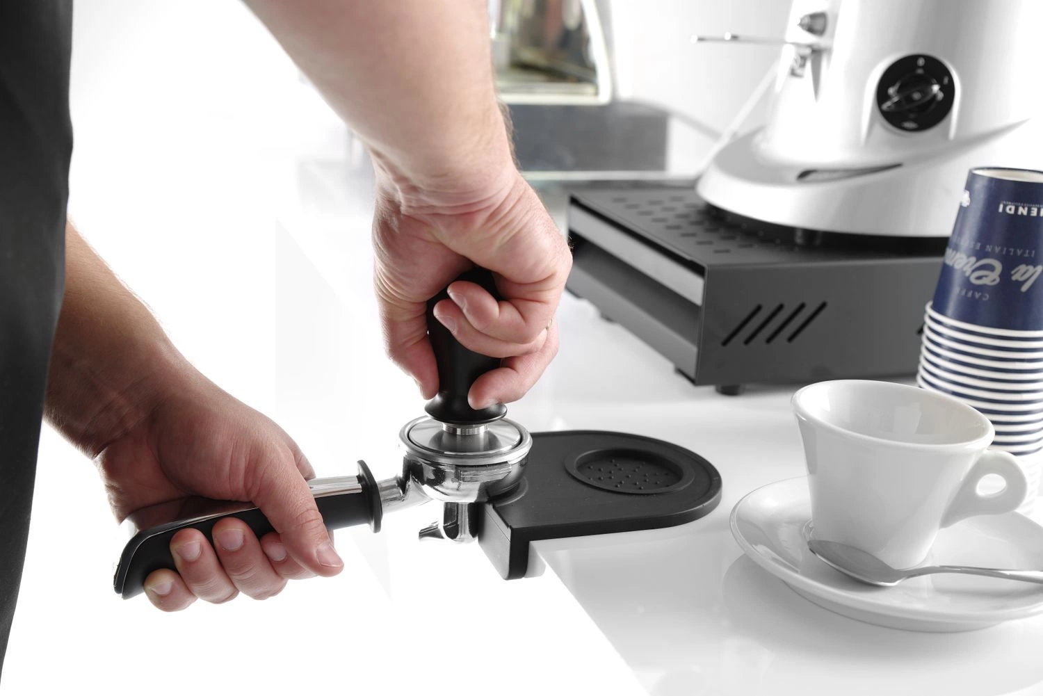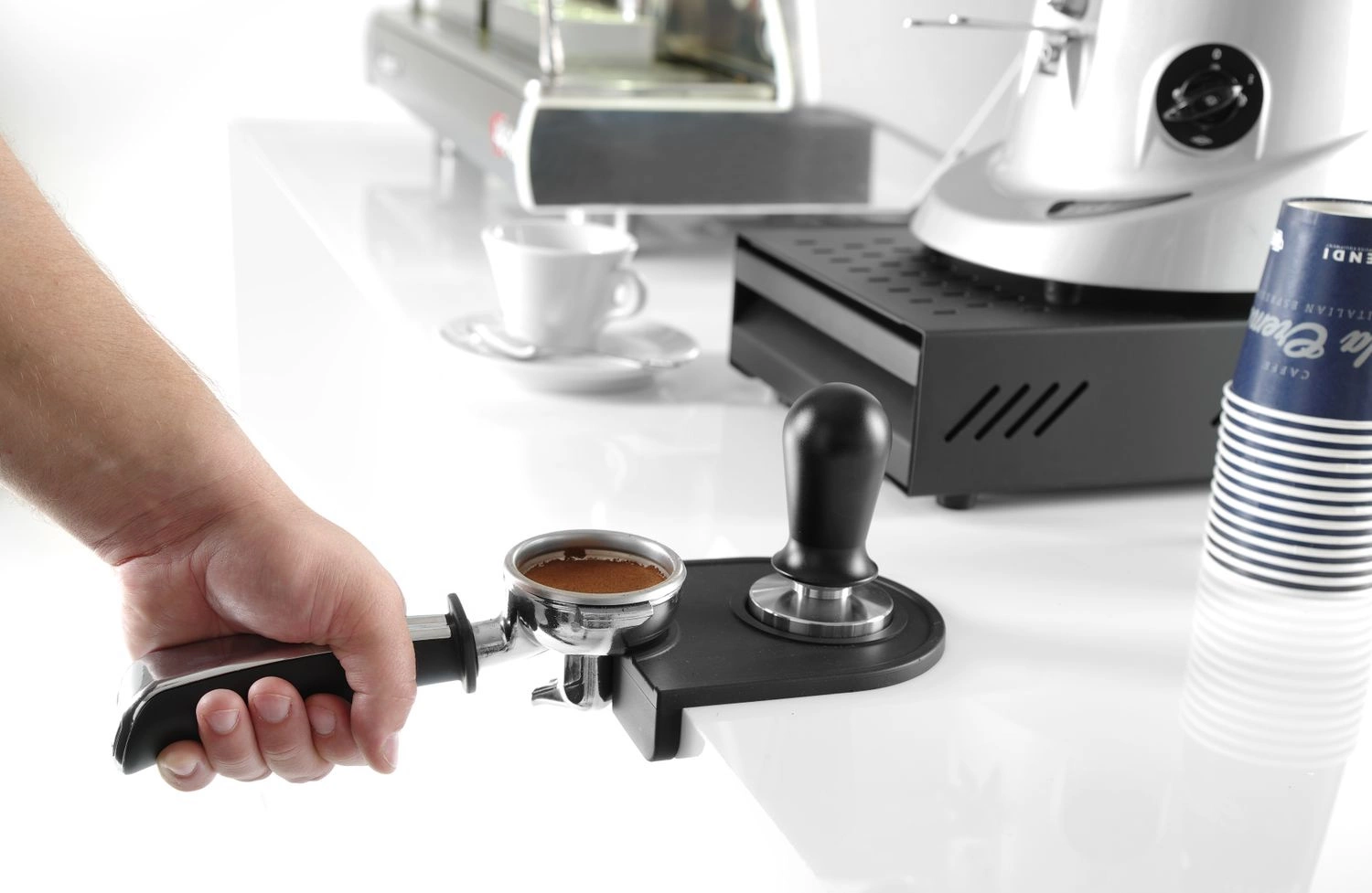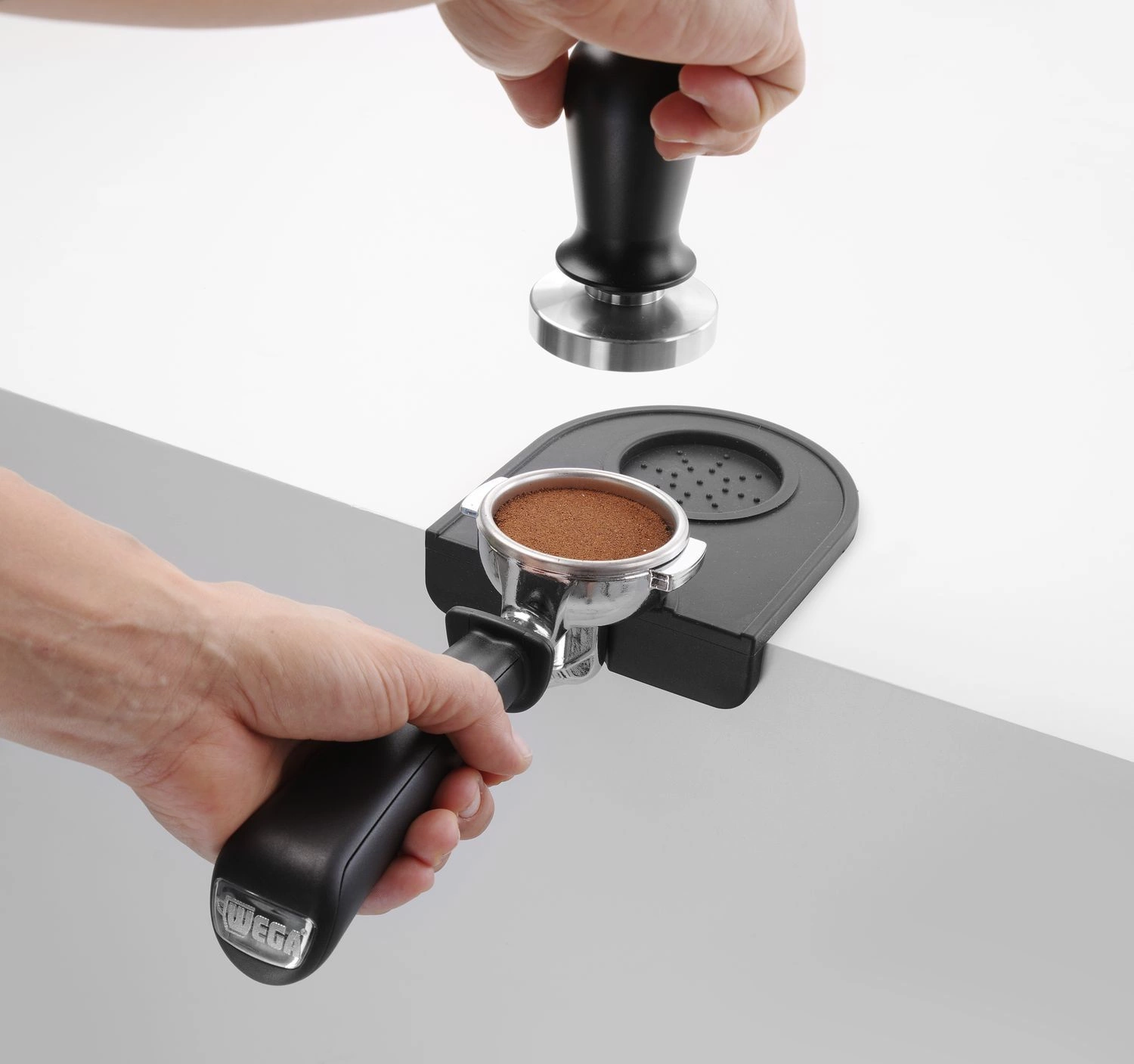 - Praktyczne rozwiązania – specjalne wycięcie na kolbę zapobiega przesuwaniu się podczas ubijania kawy, a wytłoczenie na tamper zwiększa komfort pracy.