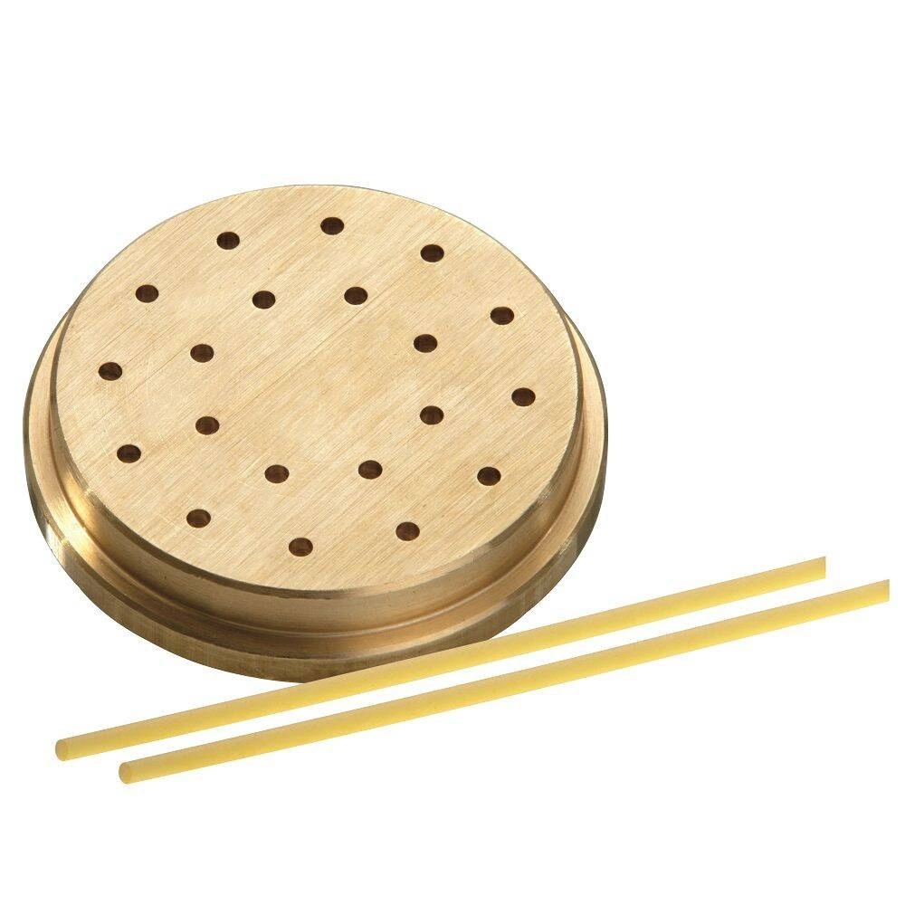 Matryca do formowania makaronu spaghetti. Pasuje do maszynki do makaronu firmy Bartscher o kodzie 101986. Wykonana z brązu. Średnica matrycy 5,5 cm. Średnica spaghetti 2 mm.