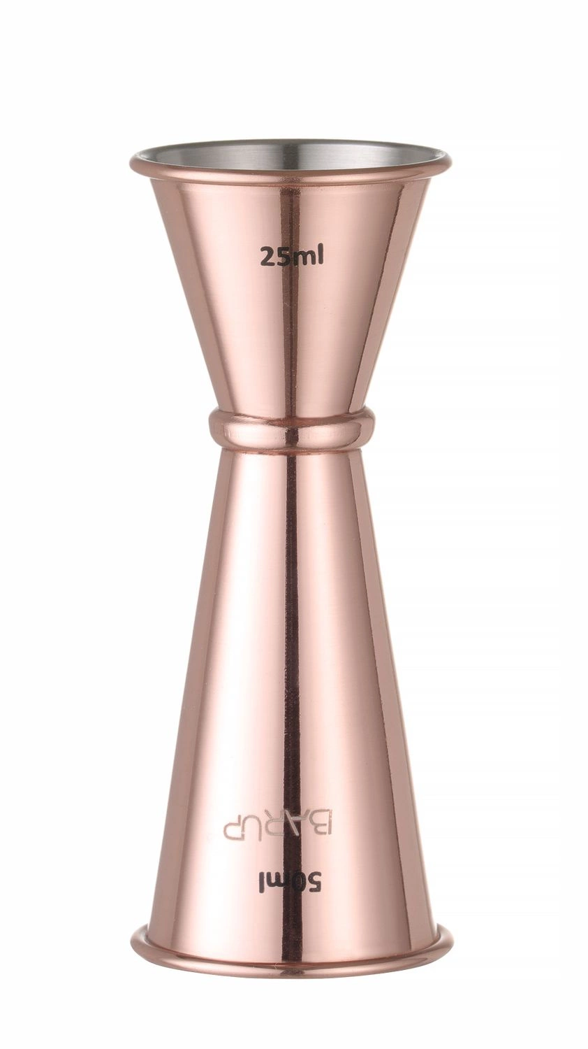 Miarka barmańska do alkoholu o pojemności 25 ml i 50 ml. Wykonana ze stali nierdzewnej pokrytej miedzią. Dodatkowo wytłoczona pojemność 35 ml