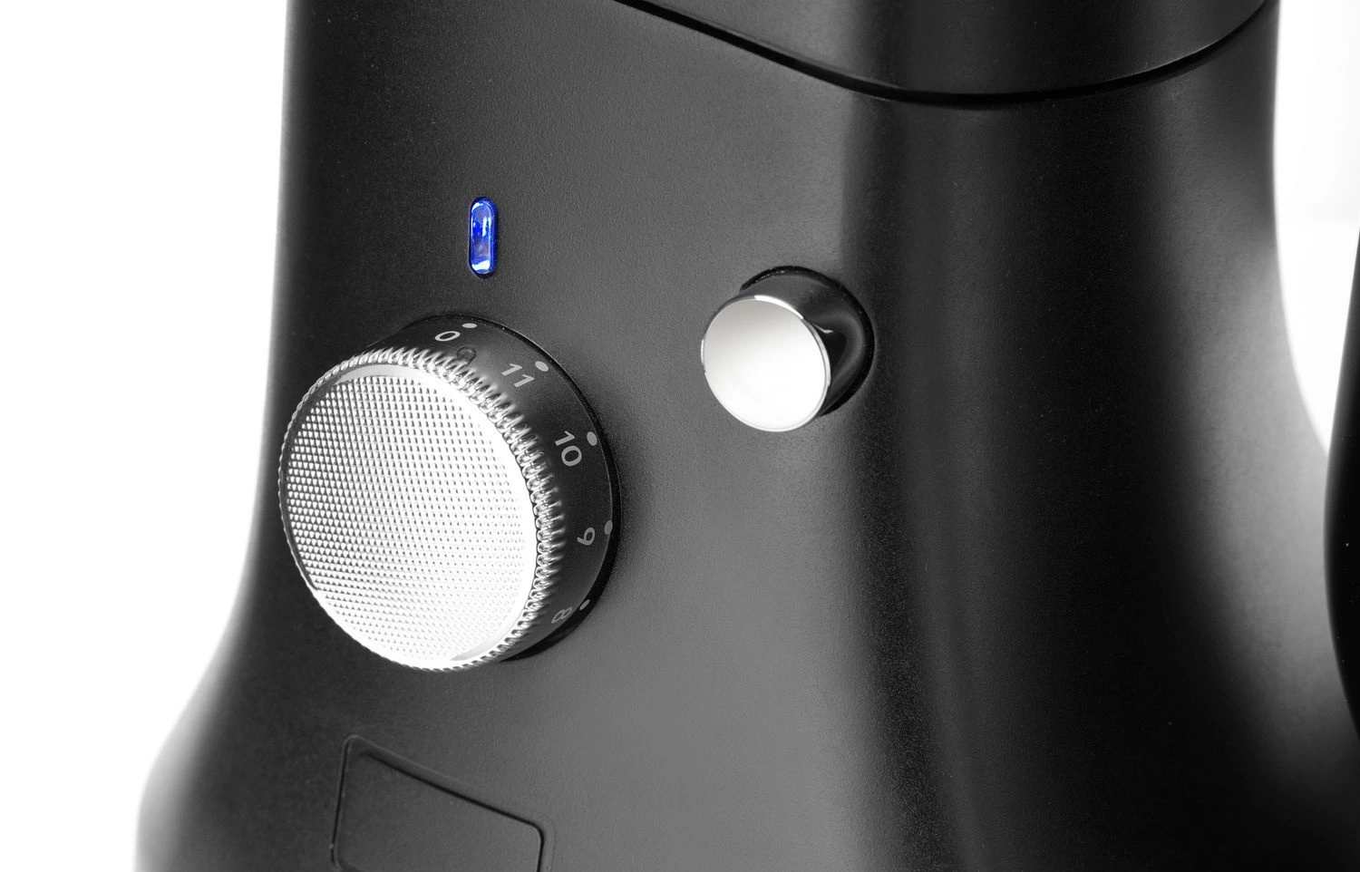W zestawie: rózga do jaj ze stali nierdzewnej, mieszadło i hak ze stali nierdzewnej do ciasta, przezroczysta osłonka miski. Akcesoria nadają się do mycia w zmywarce.