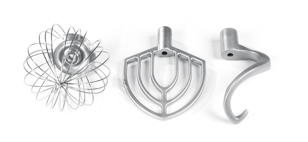 - Zestaw akcesoriów: W komplecie znajdują się trzy aluminiowe akcesoria: rózga, mieszadło oraz hak do ciasta, które umożliwiają wszechstronne zastosowanie miksera.
