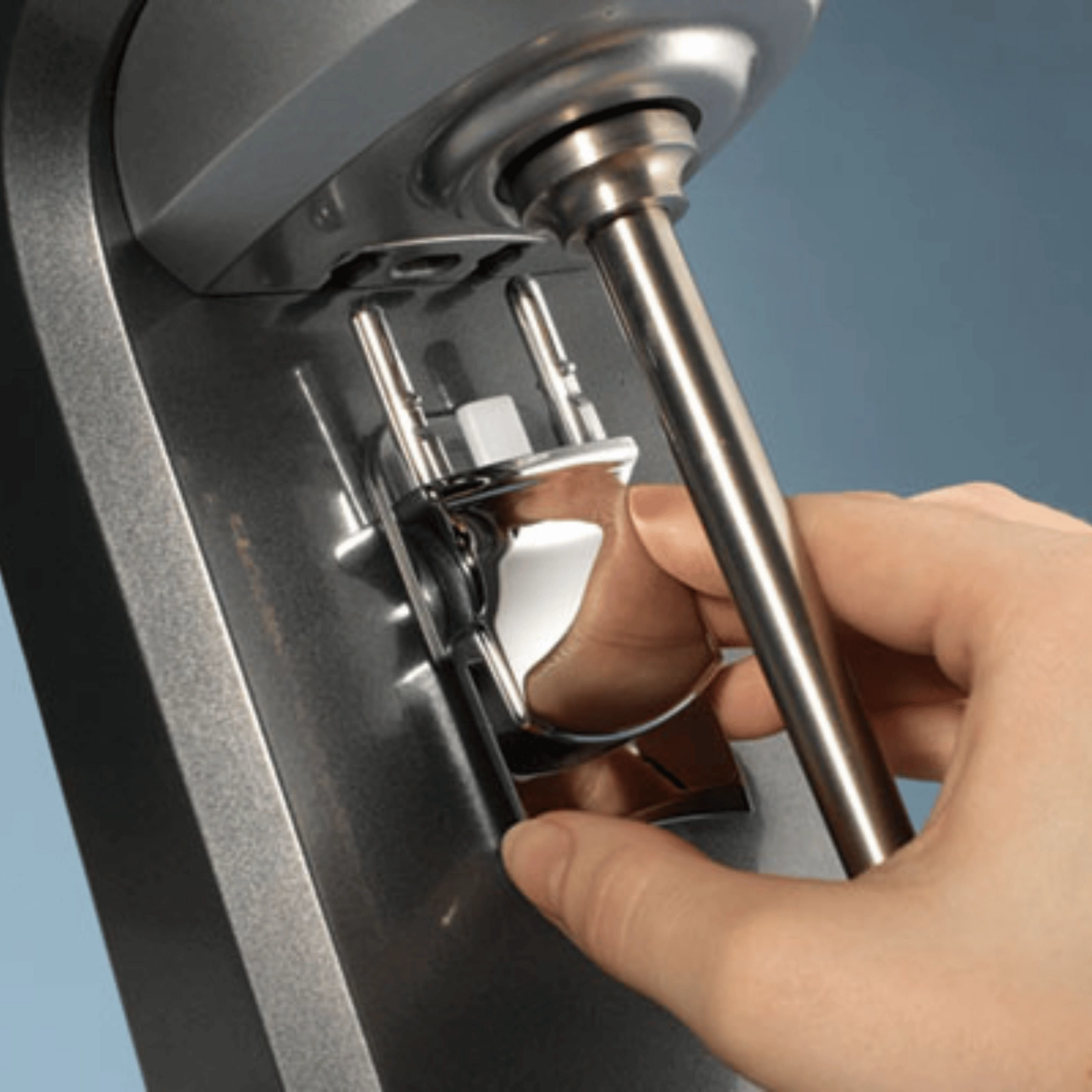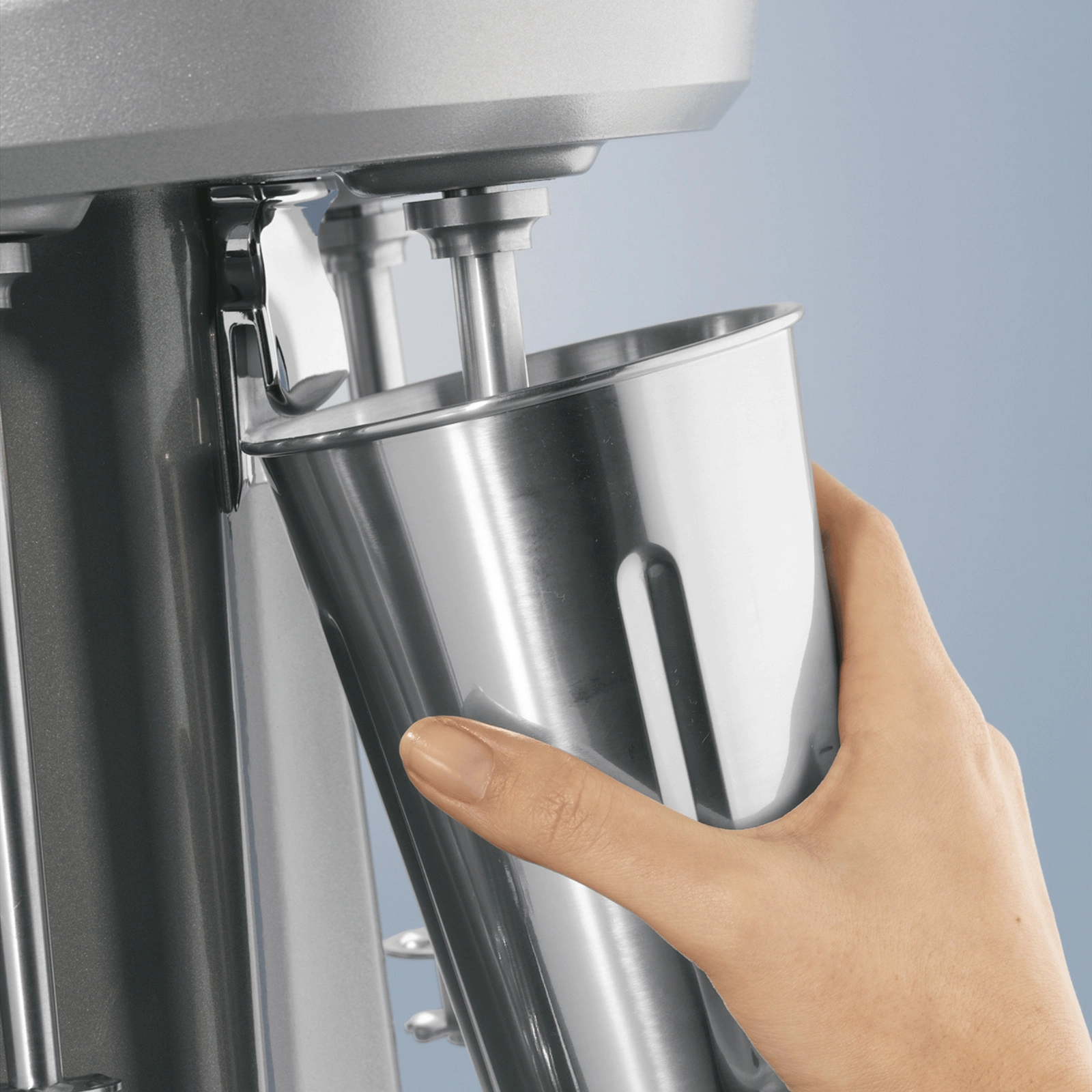 - Wytrzymała konstrukcja – Obudowa wykonana z aluminium i stali nierdzewnej zapewnia trwałość oraz łatwość utrzymania czystości. Mikser posiada także wyjmowaną prowadnicę kubka, którą można myć w zmywarce.