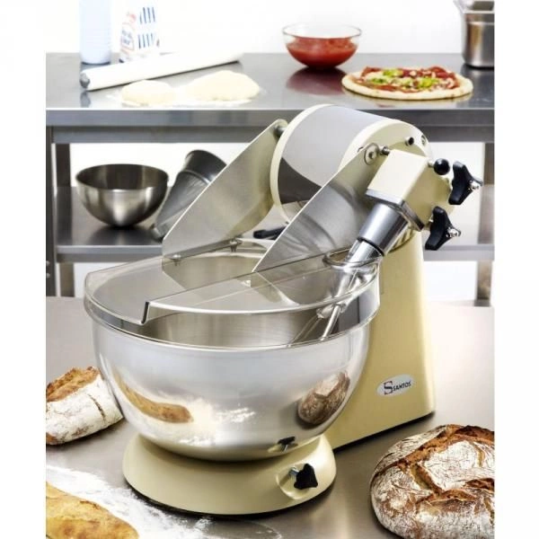 Mikser spiralny Santos 18 został zaprojektowany z myślą o długotrwałej i intensywnej eksploatacji. Dzieża wykonana jest z wysokiej jakości stali nierdzewnej, co zapewnia jej trwałość i odporność na korozję. Obudowa urządzenia to połączenie stopu aluminium oraz blachy emaliowanej, dzięki czemu całość jest lekka, a jednocześnie wytrzymała. Przeźroczysta pokrywa chroni użytkownika przed kontaktem z obracającą się spiralą, a jednocześnie umożliwia kontrolę nad procesem wyrabiania ciasta. W zestawie znajduje się mikser wraz z dzieżą i pokrywą ochronną.