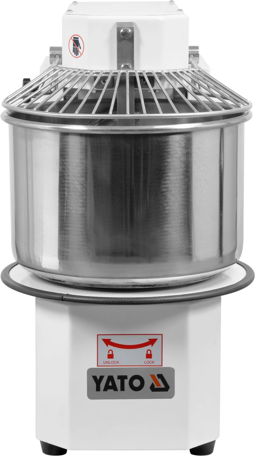 Mikser spiralny marki YATO ze wyjmowaną dzieżą o pojemności 30 l i średnicy 41 cm z uchylną głowicą. Urządzenie idealne do wyrabiania ciast ciężkich, takich jak: pizza, chleb, pierogi, pączki. Zaprojektowany z myślą o funkcjonalności i bezpieczeństwie, ten mikser spełni oczekiwania profesjonalnych kucharzy. Mikser wykonany z aluminium i stali, malowany w kolorze białym, prezentuje się nie tylko estetycznie, ale także jest łatwy do utrzymania w czystości. Dzieża i akcesoria dodatkowe zrobione ze stali nierdzewnej są bezpieczne dla kontaktu z żywnością. Maksymalny wsad ciasta wynosi 12 kg. Wbudowany timer umożliwia nastawienie czasu pracy w zakresie do 60min. Natomiast przełączenie w pozycję manual umożliwia pracę ciągłą. Wymiary urządzenia wynoszą 76x80x44 cm.