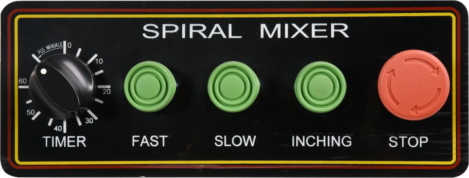 Regulacja prędkości: Mikser oferuje dwie prędkości obrotów 120 i 240 obr/min, a także bieg wsteczny, co ułatwia wyjmowanie ciasta z dzieży. Dodatkowo, mikser wyposażony jest w timer umożliwiający ustawienie czasu pracy do 60 minut oraz opcję pracy ciągłej w trybie manualnym.