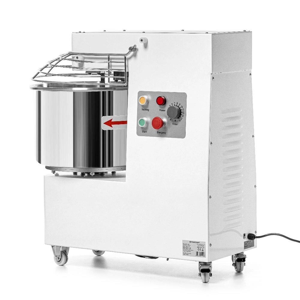 Mikser spiralny FORGAST FG10430 wyposażony jest w spiralny hak mieszający oraz stałą dzieżę, oba elementy wykonane z wysokogatunkowej stali nierdzewnej, co gwarantuje odporność na korozję i łatwość utrzymania higieny. Urządzenie posiada dwa napędy: jeden odpowiada za obrót haka, drugi za obrót dzieży, co pozwala na równomierne wyrabianie nawet bardzo gęstych ciast. Prędkość mieszadła wynosi 170 obrotów na minutę, natomiast dzieży 17 obrotów na minutę, co zapewnia optymalne warunki do mieszania różnego rodzaju mas. Dodatkowo mikser wyposażony jest w cztery kółka skrętne, w tym dwa z hamulcem, co ułatwia jego przemieszczanie i stabilizację w miejscu pracy.