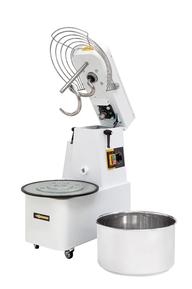 Mikser spiralny z wyjmowaną dzieżą o pojemności 32 l i podnoszoną głowicą. 2 prędkości. Mikser idealny do pizzerii, cukierni, piekarni. Obudowa z wysokiej jakości stali lakierowanej na biało. Dzieża, pokrywa bezpieczeństwa, spirala ze stali nierdzewnej 18/10. Cicha praca przekładni olejowej. Mikser posiada: przycisk zmiany prędkości (2 biegi), mikrowyłącznik pokrywy bezpieczeństwa, oraz wbudowany timer.