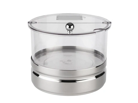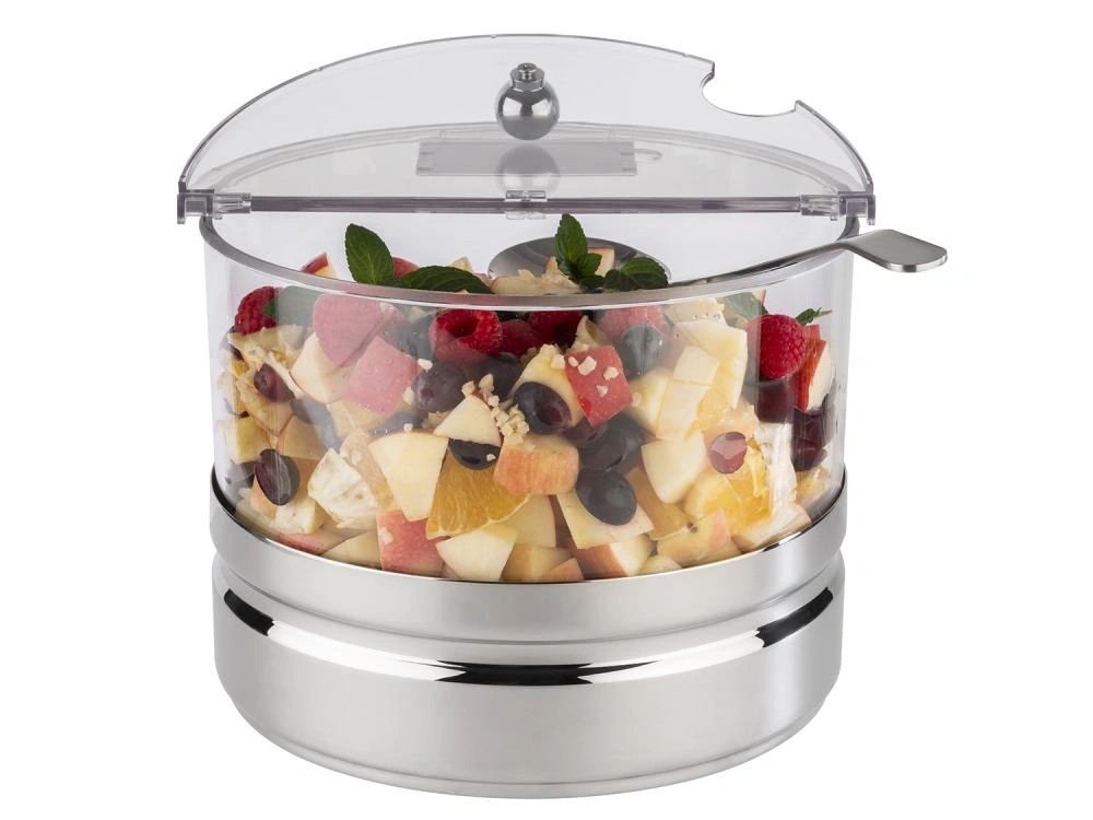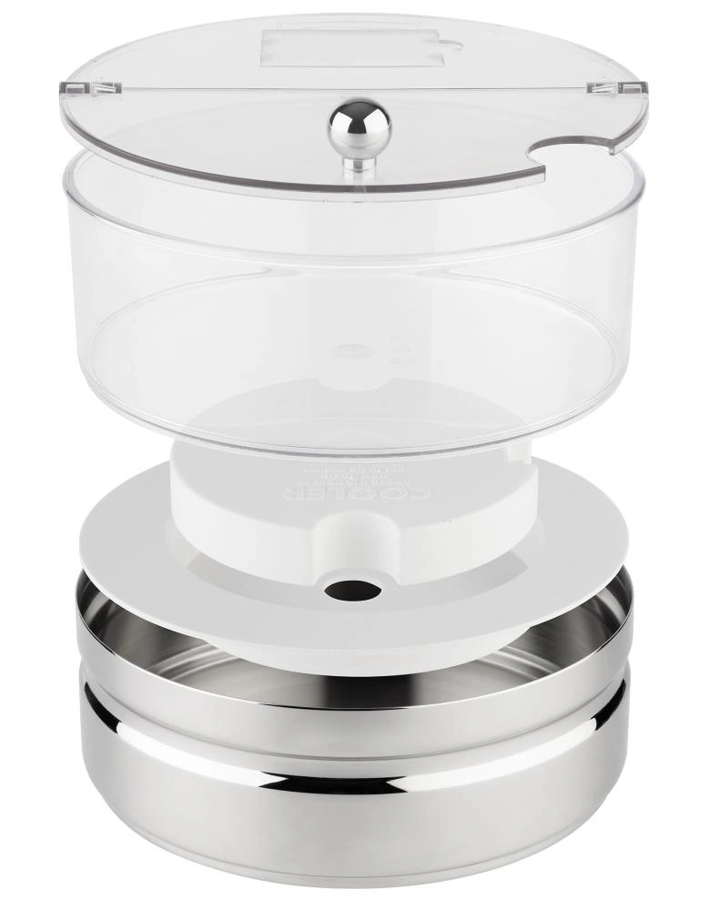 Naczynie składa się z kilku praktycznych elementów: polerowanej na wysoki połysk stalowej podstawy, wyjmowanego wkładu chłodzącego, pojemnej miski oraz uchylnej, przezroczystej pokrywy wyposażonej w tabliczkę do opisu zawartości. Taka konstrukcja zapewnia zarówno prostotę użytkowania, jak i łatwość w utrzymaniu czystości.