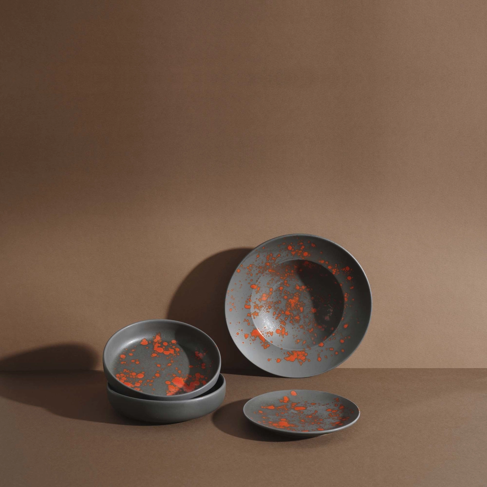 Czarna matowa porcelana wykończona kontrastowymi plamkami. Odporna i wytrzymała. Można myć w zmywarce, używać w mikrofalówce.