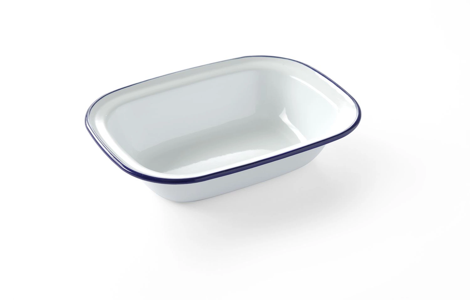 Naczynie prostokątne o wymiarach 21,5x16 cm. Wykonane z wysokiej jakości stali pokrytej białą emalią z niebieskim brzegiem. Możliwość piętrowania, Można myć w zmywarkach. Nie można używać w kuchenkach mikrofalowych.