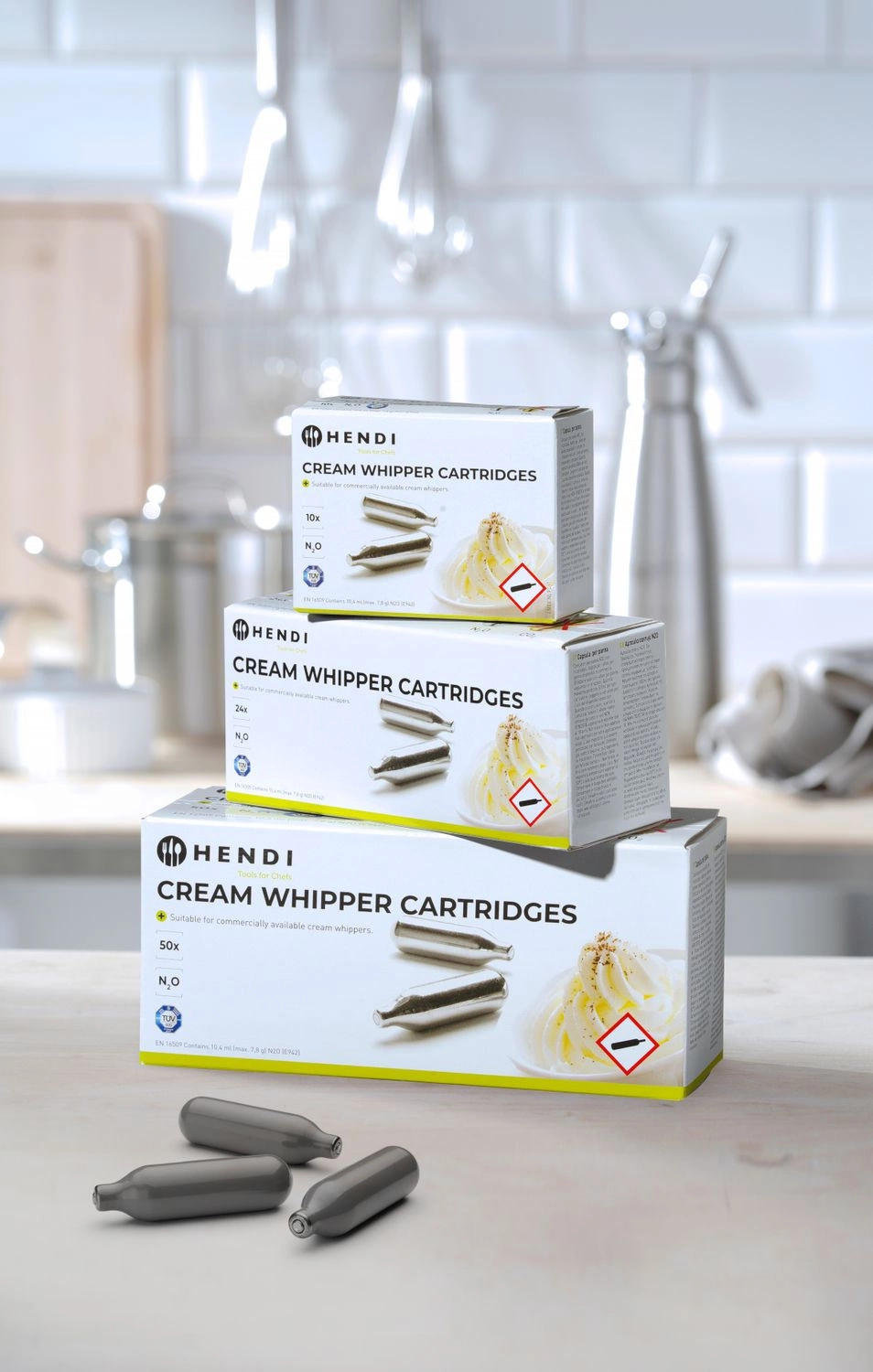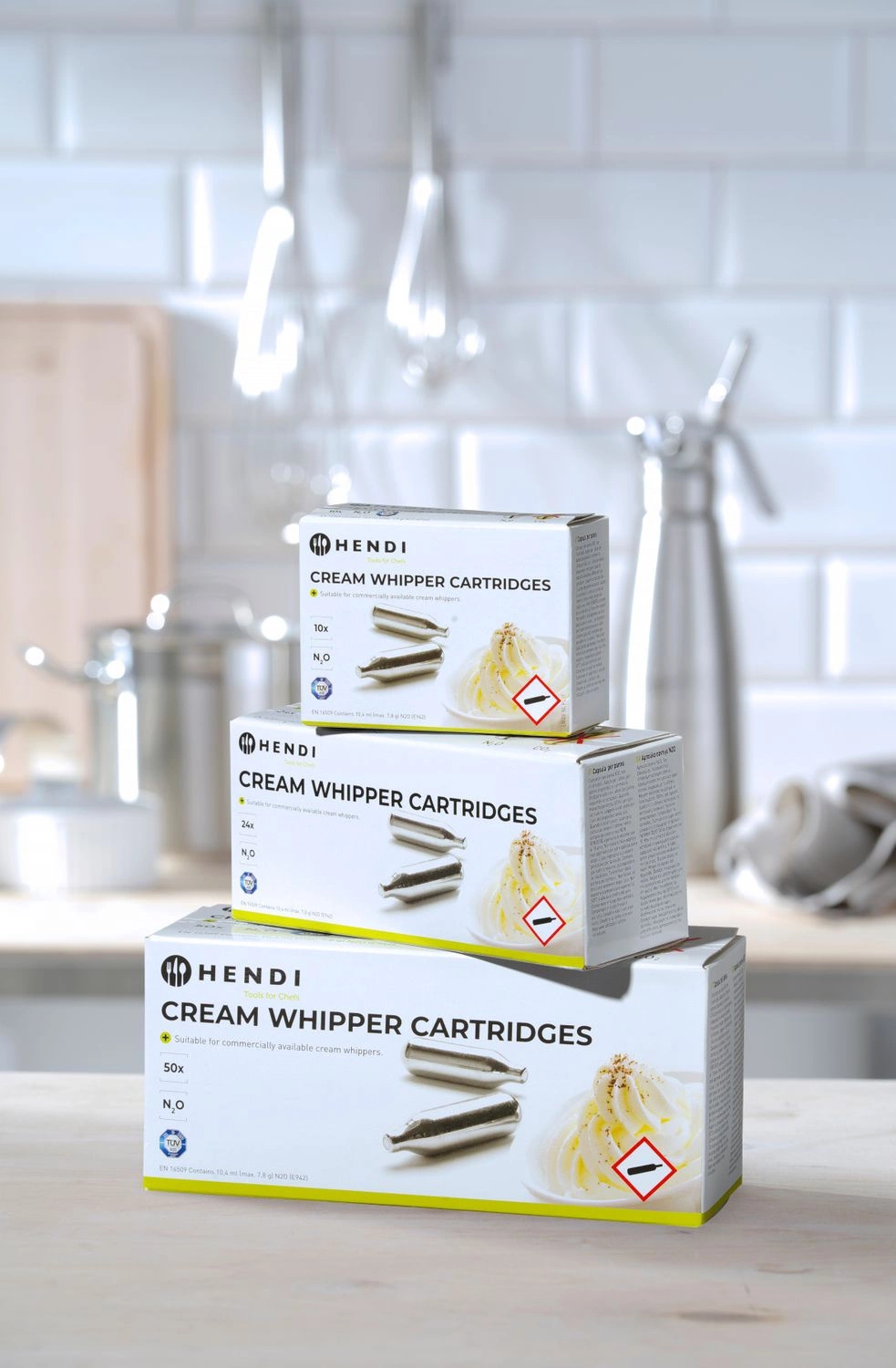 Naboje Hendi do syfonu do bitej śmietany - opakowanie 10 szt. Przydatność do użytkowania - 5 lat. Można używać w syfonach: Liss, Kidde, ISI i Kayser.