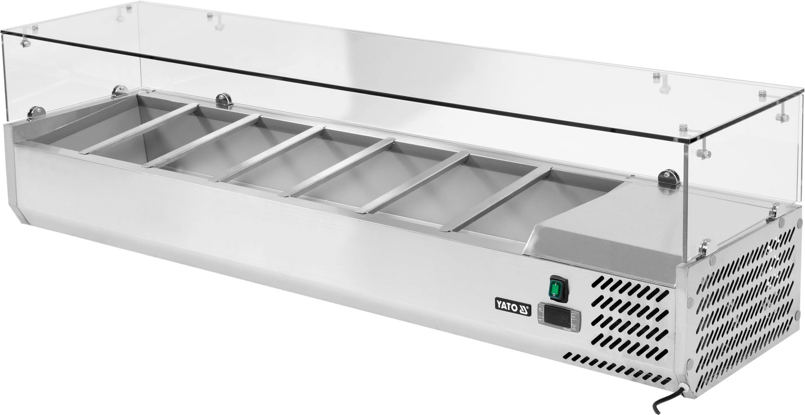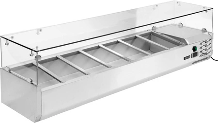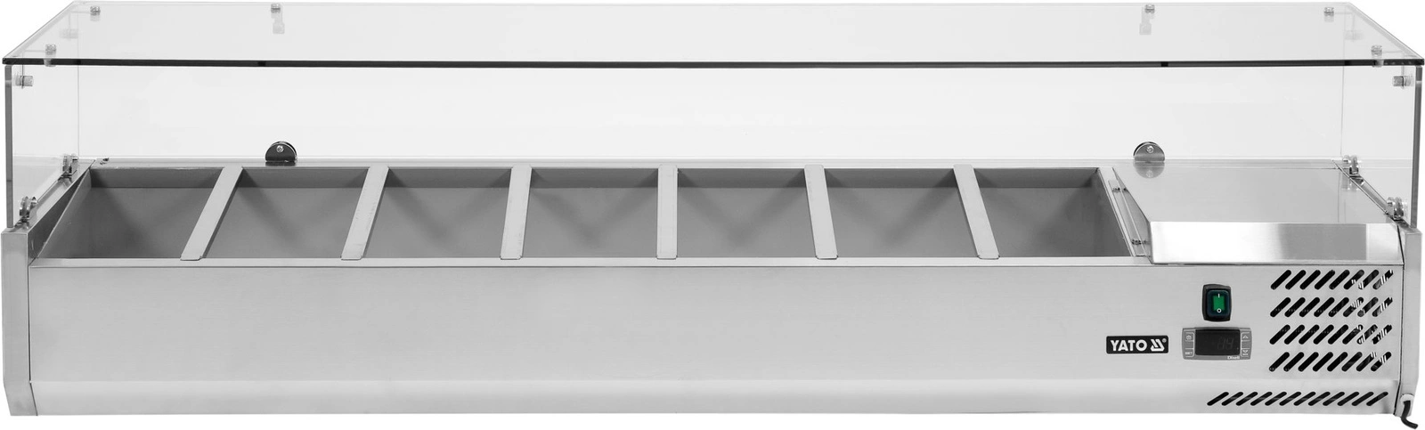 Nadstawka chłodnicza o pojemności 7x1/3 GN z szybą prostą ze szkła hartowanego wykonana ze stali nierdzewnej. Obudowa wewnętrzna i zewnętrzna ze stali nierdzewnej ss202. Chłodzenie statyczne z funkcją automatycznego odmrażania. Agregat chłodniczy boczny marki Zanussi o mocy 110 W, czynnik chłodniczy R600a Witryna jest odpowiednia dla pojemników GN o maksymalnej głębokości 15 cm. Urządzenie pracuje w zakresie temperatury od +2 do +8 stopni. Sterowanie temperaturą odbywa się za pomocą sterownika elektronicznego z wyświetlaczem.