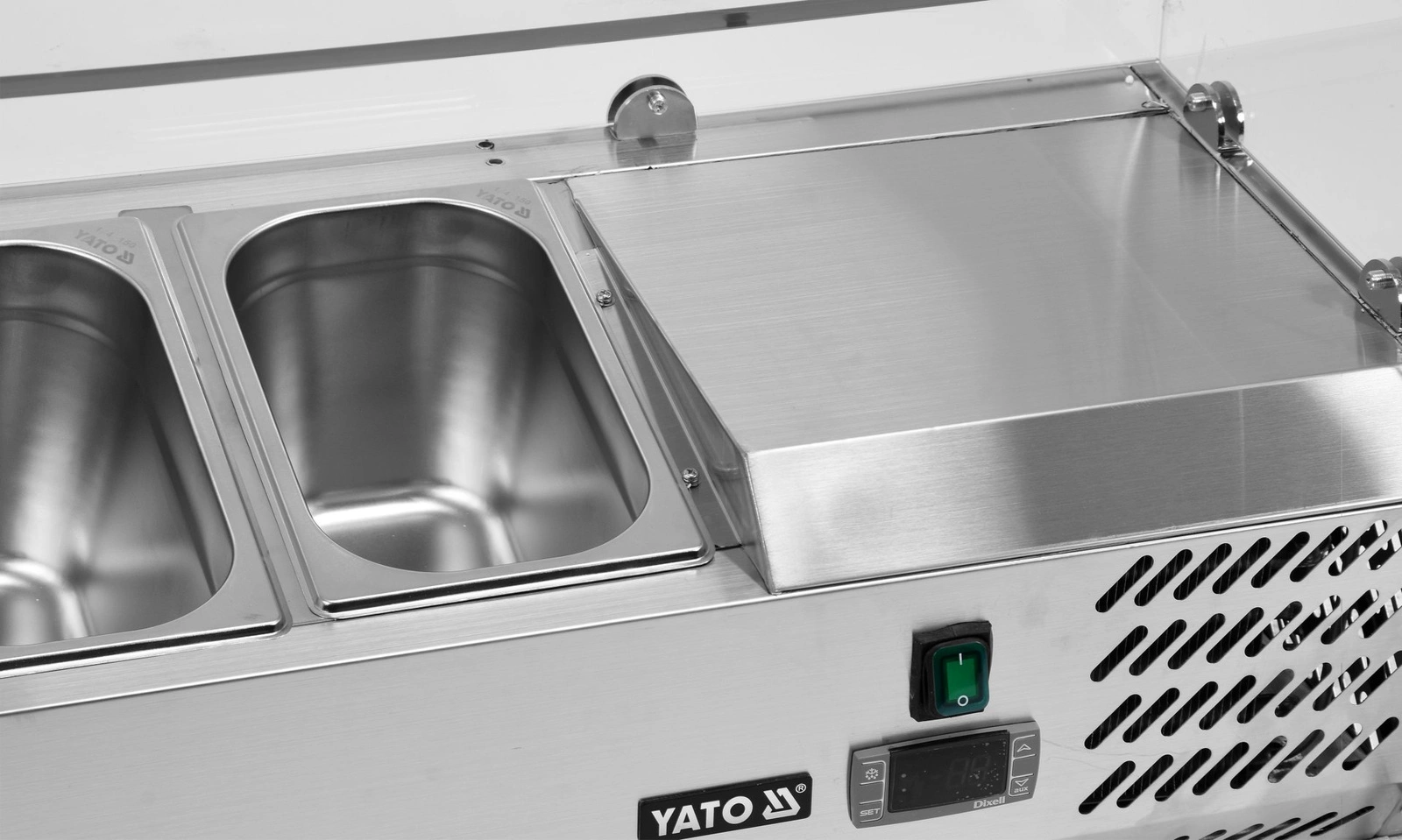 Nadstawa chłodnicza o pojemności 7x1/4 GN z szybą prostą ze szkła hartowanego wykonana ze stali nierdzewnej. Obudowa wewnętrzna i zewnętrzna ze stali nierdzewnej ss202. Chłodzenie statyczne z funkcją automatycznego odmrażania. Agregat chłodniczy boczny marki Zanussi o mocy 110 W, czynnik chłodniczy R600a Witryna jest odpowiednia dla pojemników GN o maksymalnej głębokości 15 cm. Urządzenie posiada zakres temperatury od +2 do +8 stopni, sterowanie odbywa się za pomocą sterownika elektronicznego z wyświetlaczem.