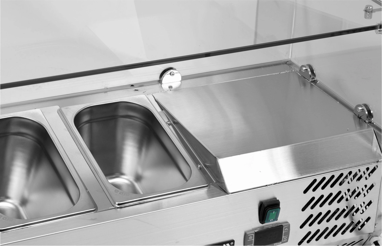 Nadstawa chłodnicza o pojemności 8x1/4 GN z szybą prostą ze szkła hartowanego wykonana ze stali nierdzewnej. Obudowa wewnętrzna i zewnętrzna ze stali nierdzewnej ss202. Chłodzenie statyczne z funkcją automatycznego odmrażania. Agregat chłodniczy boczny marki Zanussi o mocy 110 W, czynnik chłodniczy R600a Witryna jest odpowiednia dla pojemników GN o maksymalnej głębokości 15 cm. Urządzenie pracuje w zakresie +2 do +8 stopni, sterowanie odbywa się za pomocą sterownika elektronicznego z wyświetlaczem.