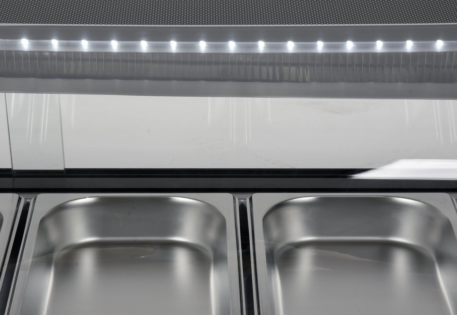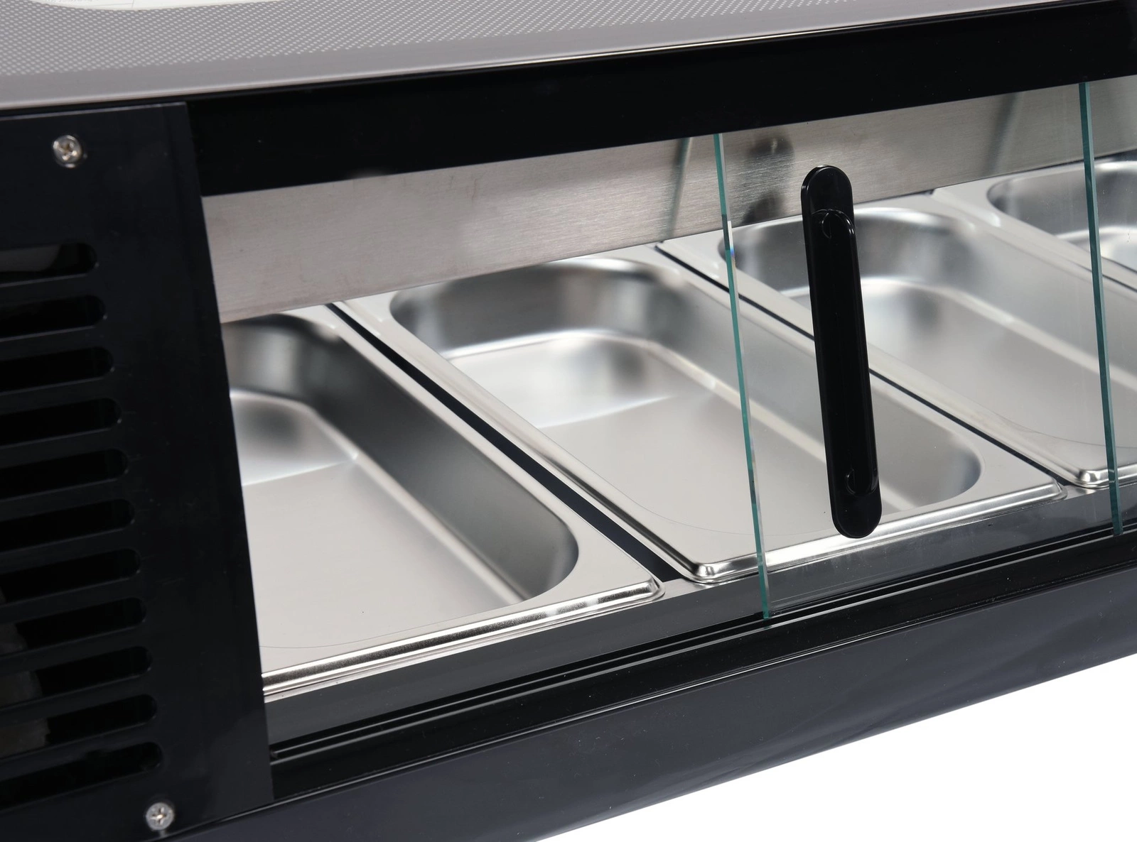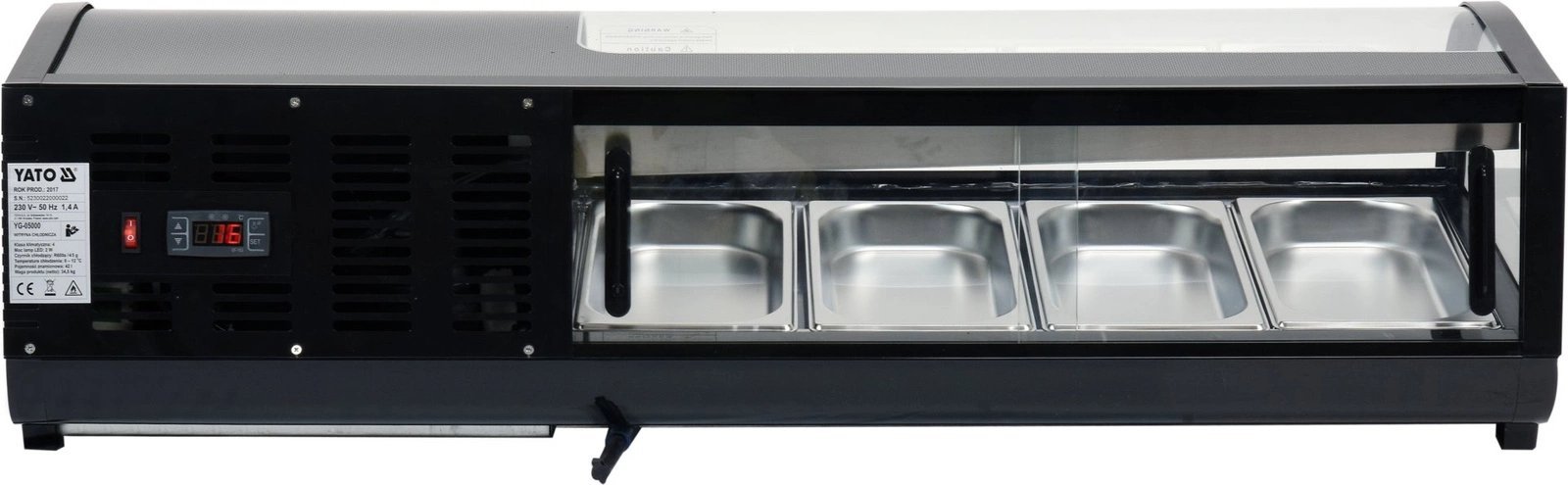 Witryna chłodnicza do sushi 4x1/3 GN. W zestawie z 4 pojemnikami 4 x 1/3 GN ze stali nierdzewnej. Przesuwne drzwiczki ze szkła hartowanego umożliwiają dostęp do komory. Zaokrąglona frontowa szyba także wykonana ze szkła hartowanego nad którą znajduje się oświetlenie LED. Czynnik chłodniczy R600a, zakres temperatur 0-12 o C. Chłodzenie statyczne z funkcją automatycznego odmrażania. Sterownik elektryczny z wyświetlaczem temperatury.