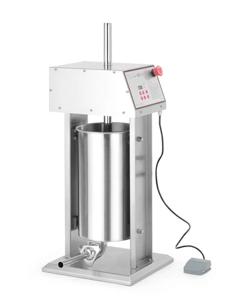 Elektryczna nadziewarka do kiełbas pionowa o pojemności 15 l. Wykonana ze stali nierdzewnej. 4 lejki o średnicach 16, 22, 32 i 38 mm, pozwalające na przygotowanie kiełbas różnej grubości.
