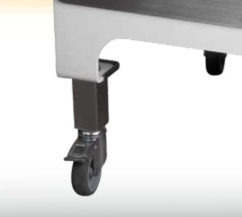 - Koła z blokadą i hamulcem: Nogi wyposażone są w koła o średnicy 75 mm, z czego dwa posiadają funkcję blokady obrotu oraz hamulec. Takie rozwiązanie umożliwia wygodne przesuwanie krajalnicy w dowolne miejsce, a następnie jej bezpieczne unieruchomienie podczas użytkowania.
