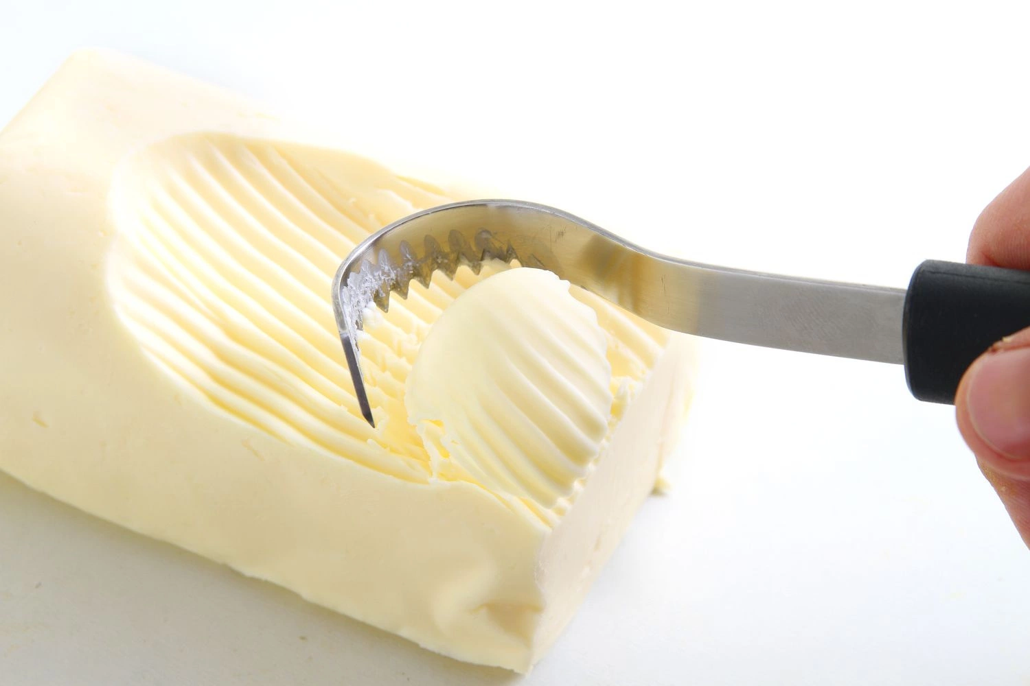 Nóż dekoracyjny do masła wykonany ze stali nierdzewnej. Uchwyt z polipropylenu. Nóż można myć w zmywarkach.