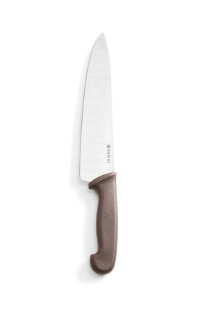Nóż kucharski do mięs brązowy HACCP. Wykonany ze stali nierdzewnej, uchwyt z polipropylenu w kolorze brązowym. Długość ostrza 24 cm, całego noża 38,5 cm. Nóż nadaje się do mycia w zmywarkach.