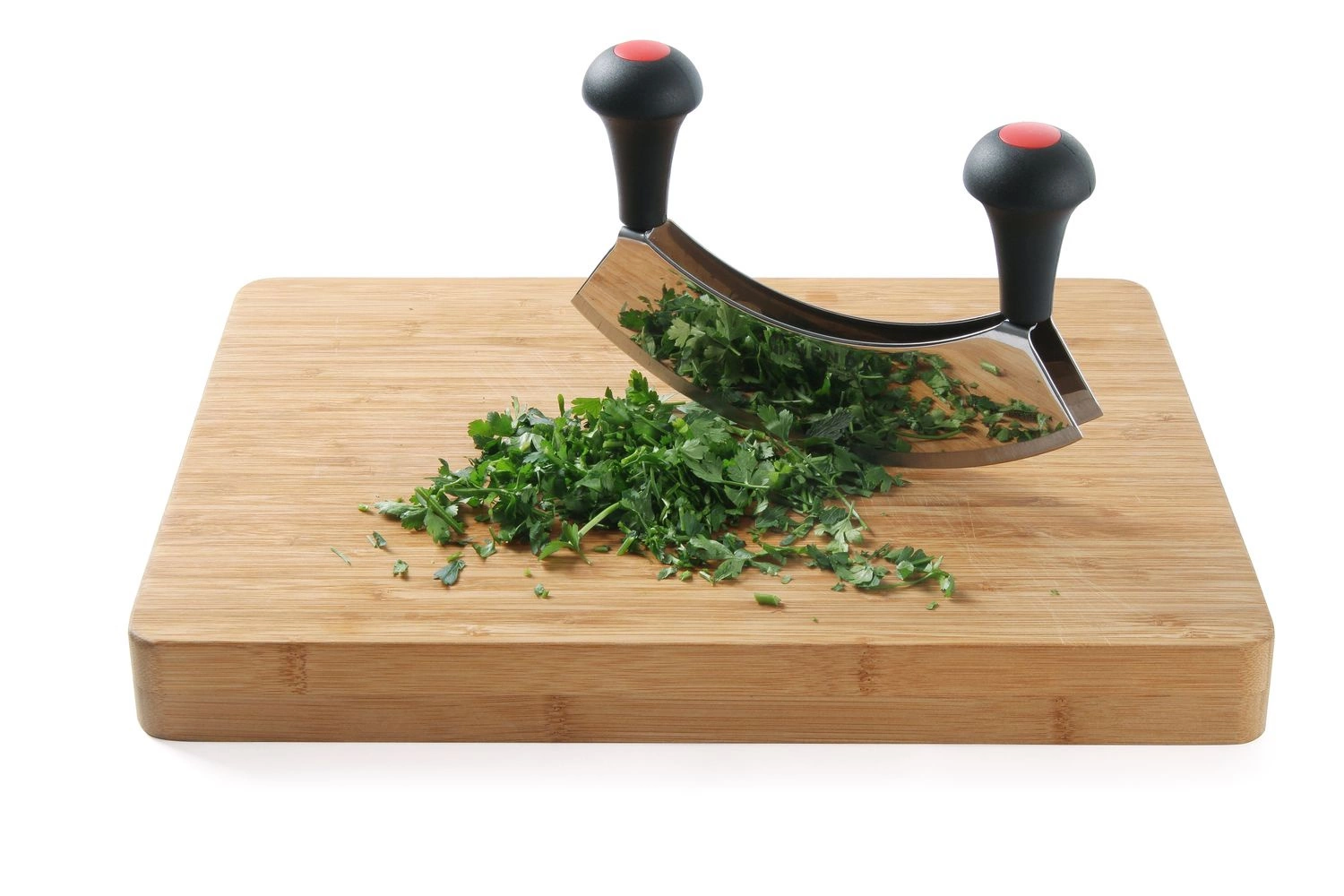 Nóż do siekania ziół z podwójnym ostrzem. Ostrze wykonane ze stali nierdzewnej, rączka wykonana z polipropylenu. Można myć w zmywarkach.