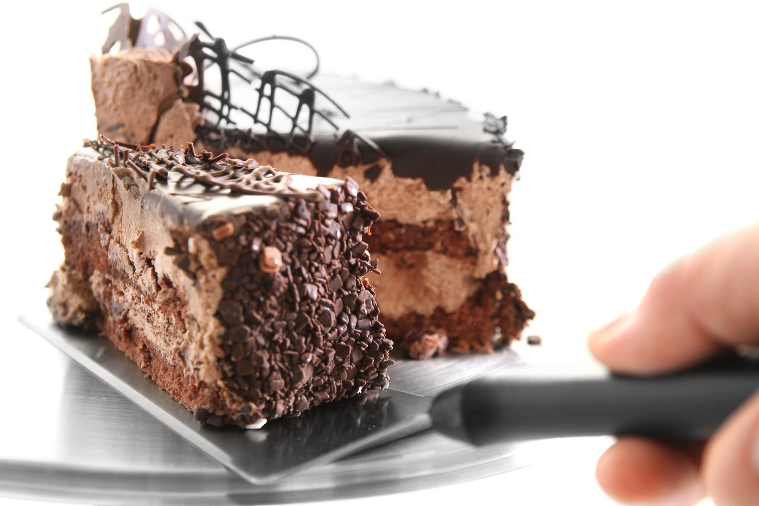 Nóż - łopatka do tortu wykonana ze stali nierdzewnej z rączką z czarnego polipropylenu.