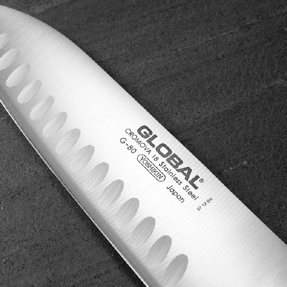 Nóż Santoku G-80 marki GLOBAL to japoński nóż o wszechstronnym zastosowaniu, przeznaczony głównie do mięsa, warzyw i ryb. Ponieważ posiada cienkie ostrze, znakomicie się też sprawdzi przy krojeniu chleba, plastrowaniu owoców czy siekaniu ziół. Duża klinga ułatwia przenoszenie pokrojonych produktów do salaterki lub na patelnię. Dzięki żłobionemu ostrzu produkty łatwiej odchodzą od noża.