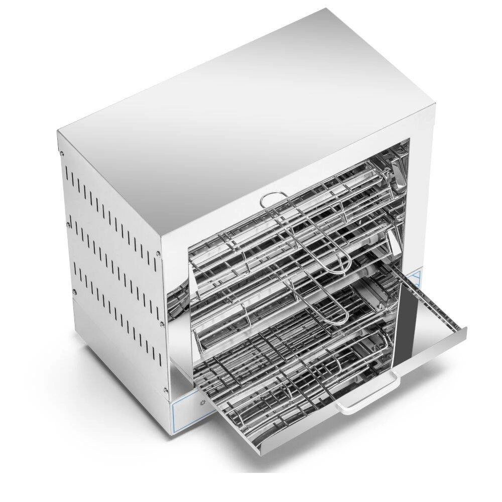 • Regulowane kwarcowe grzałki – trzy poziomy grzania umożliwiają dostosowanie intensywności opiekania do różnych rodzajów potraw, od delikatnych bułek po grubsze zapiekanki.
