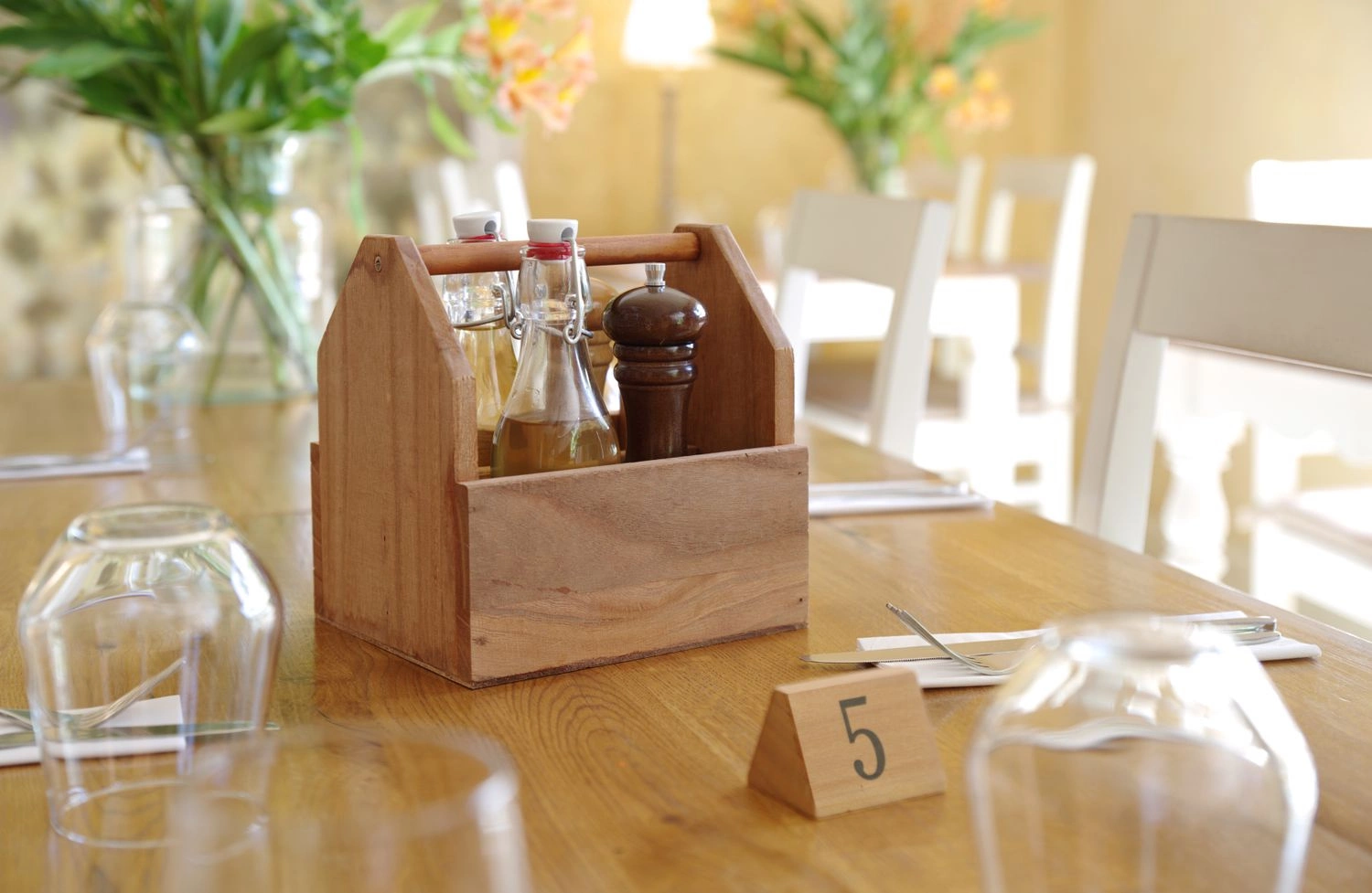 Organizer stołowy wyposażony w 2 przegródki oraz uchwyt. Wykonany z wytrzymałego drewna.