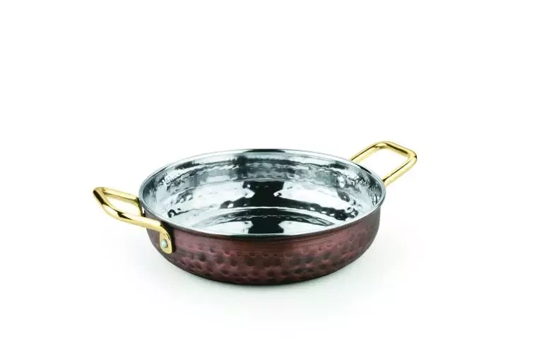 Patelnia została wykonana z wysokiej jakości miedzi, wykończonej w antycznym stylu z efektownym młotkowaniem, co nie tylko zwiększa jej walory estetyczne, ale także zapewnia trwałość i odporność na uszkodzenia. Dwa solidne uchwyty ułatwiają przenoszenie nawet gorącego naczynia, dzięki czemu idealnie nadaje się do bezpośredniego serwowania dań z pieca lub płyty na stół. W zestawie znajduje się sama patelnia, która świetnie sprawdzi się zarówno w domowych warunkach, jak i w profesjonalnej gastronomii – na przykład do serwowania tapas, mini dań głównych czy oryginalnych przystawek.