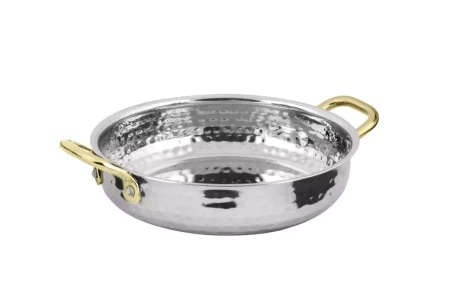 Patelnia do serwowania z dwoma uchwytami to eleganckie i praktyczne naczynie, które doskonale sprawdzi się podczas podawania dań bezpośrednio na stół. Wykonana z młotkowanej stali, wyróżnia się wyjątkowym designem oraz solidnością wykonania. Idealna do serwowania finger food, tapas czy przystawek zarówno w domowej kuchni, jak i w restauracji.