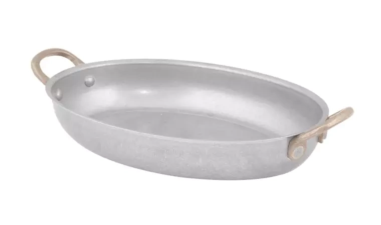 Patelnia owalna do serwowania z dwoma uchwytami to praktyczne naczynie wykonane z wysokiej jakości stali nierdzewnej w stylu vintage. Kompaktowy rozmiar i wygodne uchwyty czynią ją idealnym wyborem do efektownego podawania dań bezpośrednio na stół, zarówno w restauracji, jak i podczas przyjęć domowych. Świetnie sprawdzi się do serwowania finger food, przystawek lub niewielkich porcji dań głównych.