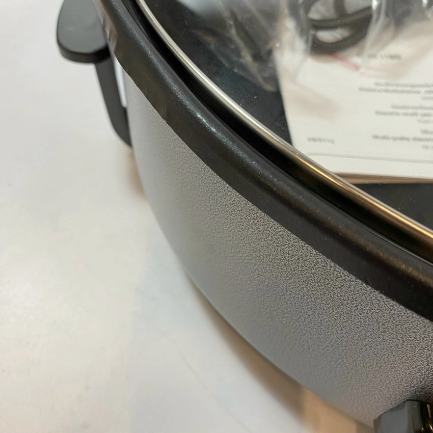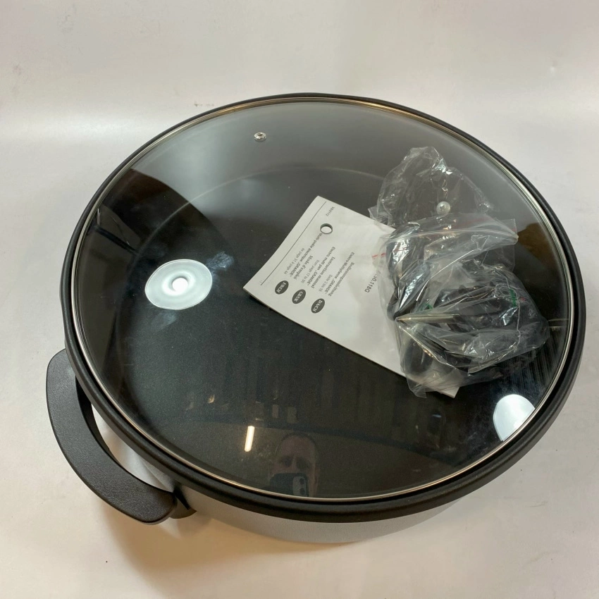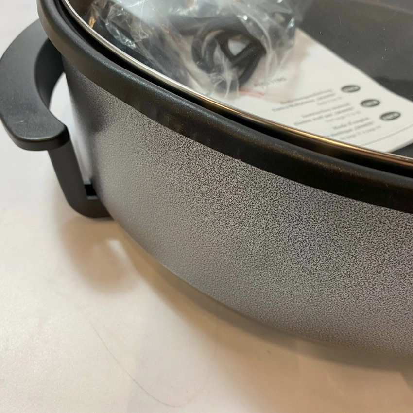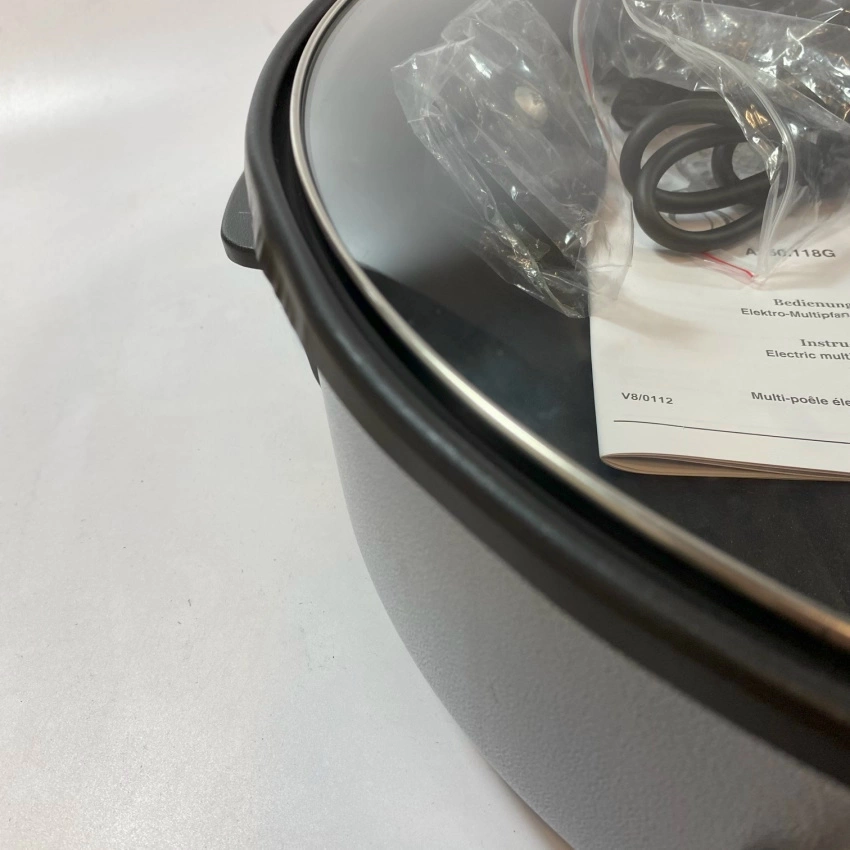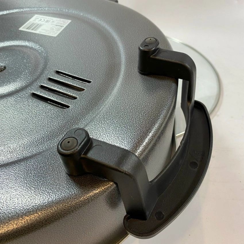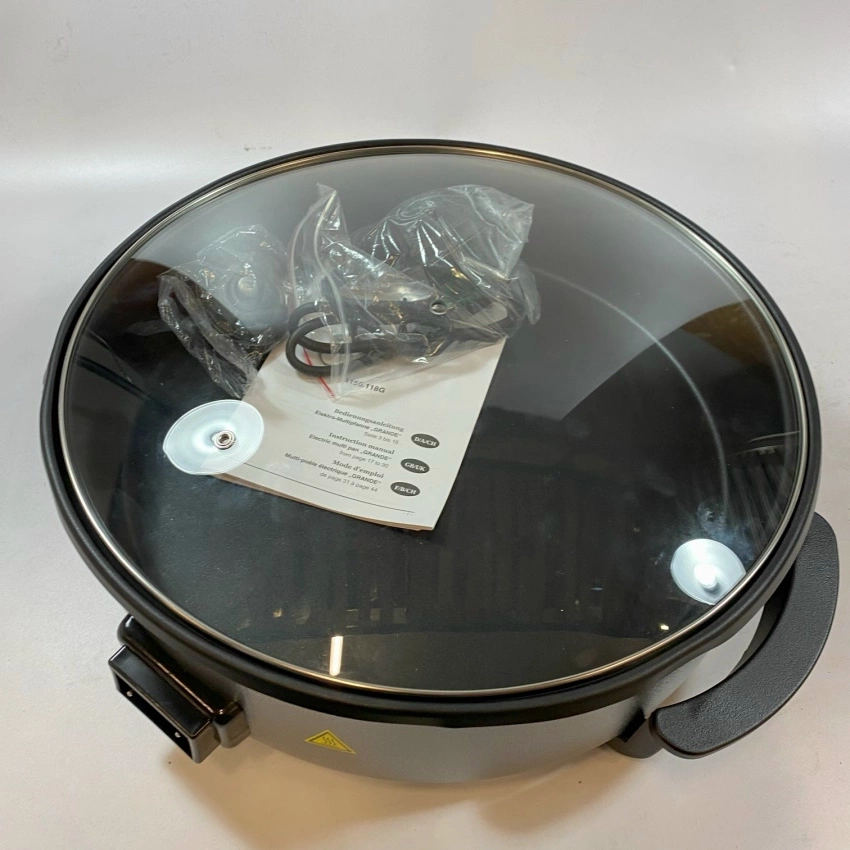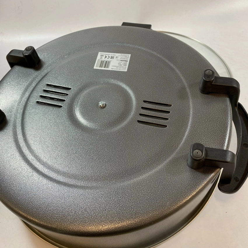 Patelnia uniwersalna okrągłą elektryczna z powłoką nieprzywierającą. Szklana pokrywka. Głębokość około 8 cm. Średnica wewnętrzna 38 cm. Całkowita wysokość patelni 20 cm.
