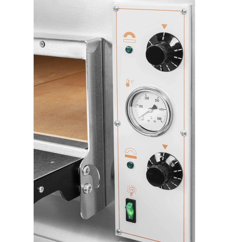 Piec do pizzy 2-komorowy ONE 66 XL marki RestoQuality wykonany ze stali nierdzewnej i stali powlekanej. Pomieści 12 pizz o śr. 36 cm. Wewnątrz płyta szamotowe o grubości 15 mm, umieszczona w dolnej części komory. Sterowanie manualne. Grzałki górne i dolne posiadają niezależne termostaty z możliwością regulacji od 50 do 400°C. Na panelu sterowania znajduje się analogowy termometr pozwalający kontrolować temperaturę wewnątrz komory pieca. Urządzenie posiada izolację wykonaną z wełny mineralnej. W komorze znajduje się oświetlenie. Uchwyt drzwi wykonany ze stali nierdzewnej.