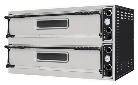 Piec do pizzy 2-komorowy SLIM LINE 33 ze sterowaniem manualnym. Każda komora pieca zmieści jednorazowo 3 pizze o maksymalnej średnicy 35 cm. Front urządzenia jest wykonany ze stali nierdzewnej, a pozostała część obudowy ze stali. Izolacja z wełny mineralnej. Dno komory wyłożone płytami szamotowymi o grubości 14 mm. Grzałki usytuowane na górze i na dole komory. Regulacja grzałek za pomocą niezależnych termostatów. Urządzenie posiada zakres temperatury od 50 do 455°C, timer z zakresem do 15 minut oraz oddzielny termometr dla każdej komory.