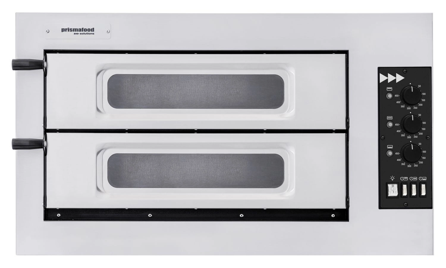 Piec do pizzy 2-komorowy BASIC 2/50 VETRO ze sterowaniem manualnym. Komora dostosowana do pizzy o maksymalnej średnicy 50 cm. Front urządzenia jest wykonany ze stali nierdzewnej, a pozostała część obudowy ze stali malowanej na czarno. Izolacja z wełny mineralnej. Dno komory wyłożone płytami szamotowymi. Grzałki usytuowane na górze i na dole obu komór. Regulacja grzałek za pomocą niezależnych termostatów. Zakres temperatury wynosi od 45 do 455°C.