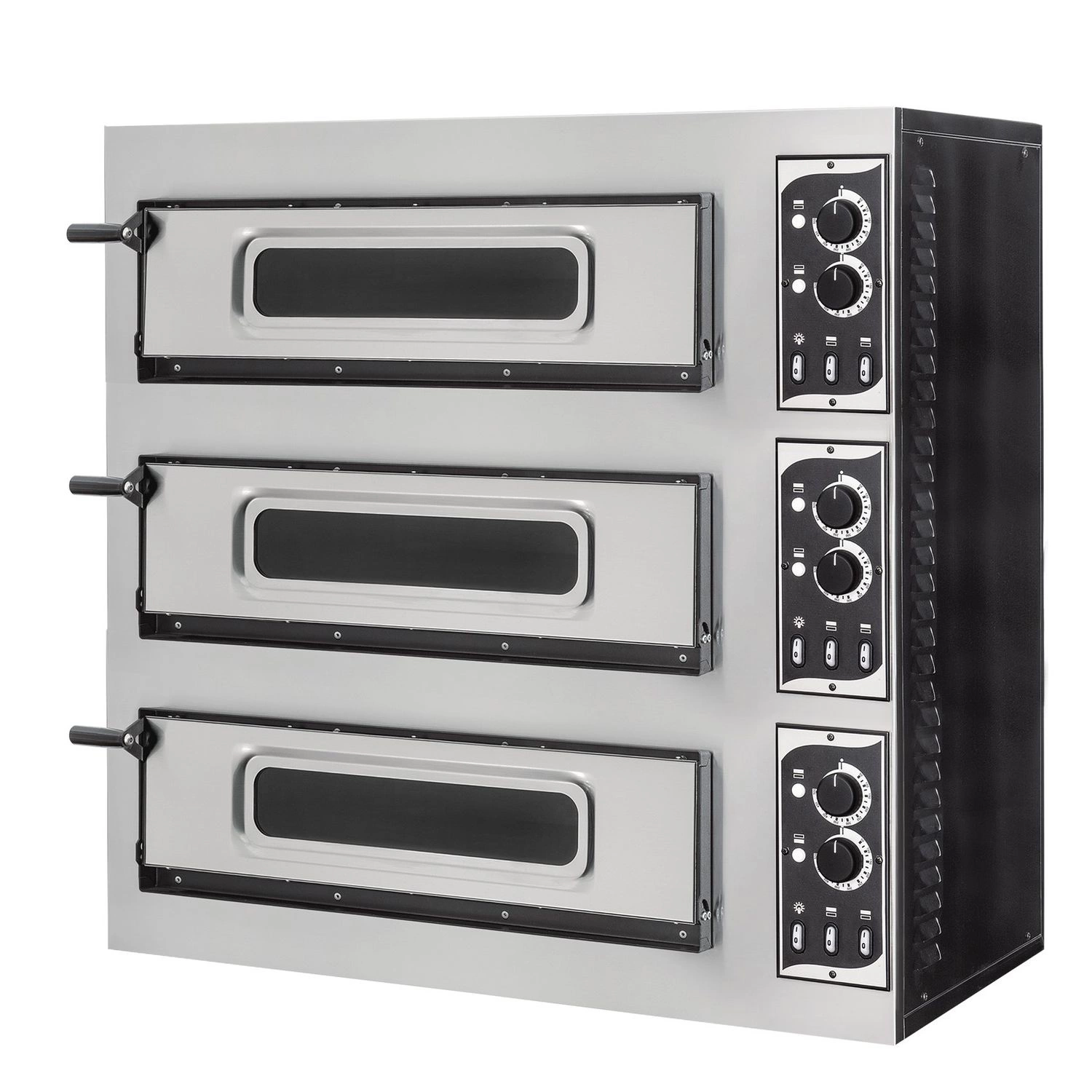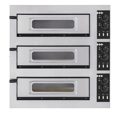 Piec do pizzy 3-komorowy elektryczny marki Prismafood. Umożliwia jednoczesny wypiek aż 3 blach z pizzą o wymiarach 60x40 cm lub 3 pizz o śr. 45 cm lub większą liczbę mniejszych pizz. Piec idealnie sprawdzi się w dużych pizzeriach. Zakres temperatury urządzenia wynosi od 45 do 455°C. Sterowanie manualne osobne dla każdej komory. Na panelu sterowania znajdują się osobne pokrętła do sterowania temperaturą grzałki górnej i dolnej. 3 przełączniku umożliwiają włączenie oświetlenia komory, samej grzałki dolnej lub samej grzałki górnej. Dno komory pieca wyłożone jest kamieniem szamotowym dla szybkiego i równomiernego nagrzewania komory. Przeszklone drzwi do każdej z komór umożliwiają śledzenie procesu wypiekania. Obudowa pieca wykonana jest ze stali malowanej na czarno, front i drzwi ze stali nierdzewnej.