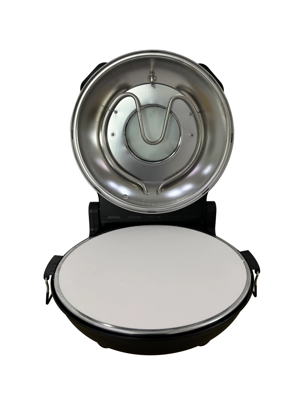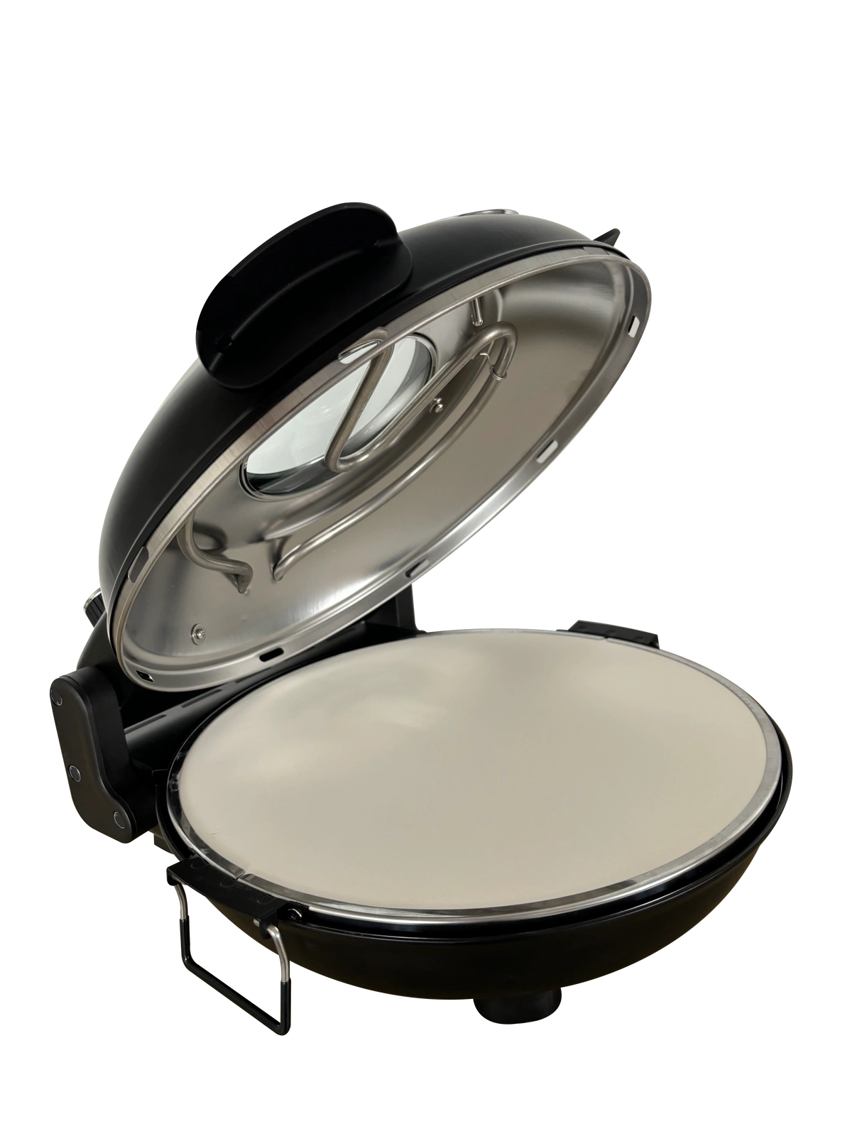 - Płyta szamotowa o średnicy 310 mm – zapewnia równomierną dystrybucję ciepła, co przekłada się na profesjonalny efekt wypieku i strukturę zbliżoną do pizzy z pieca opalanego drewnem. Kamień szamotowy doskonale magazynuje ciepło, co pozwala uzyskać chrupiący spód.