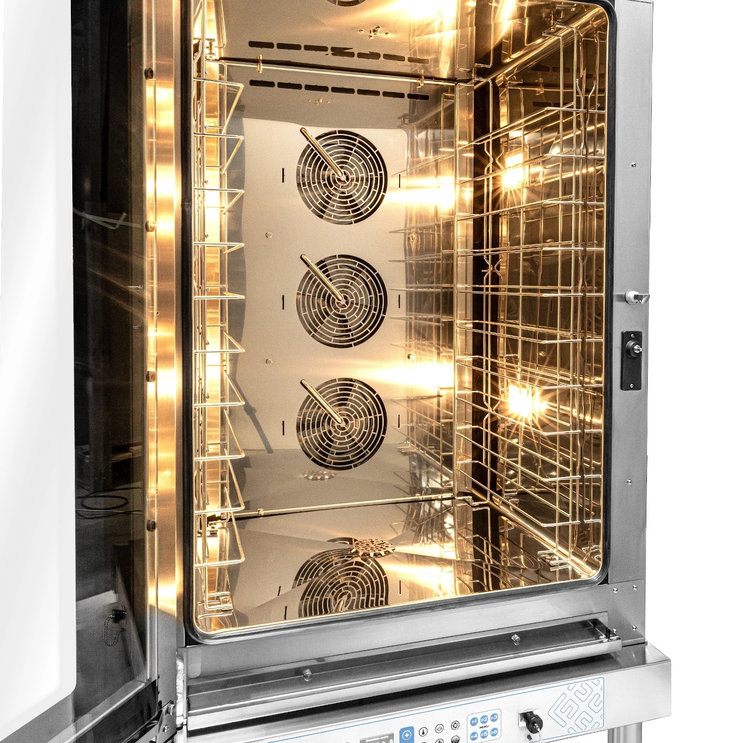 - Pojemność wsadu: 10 x GN 1/1 lub 10 x blachy 60x40 cm – umożliwia jednoczesne przygotowanie dużej ilości potraw, co jest niezwykle przydatne w obiektach o dużym natężeniu pracy.