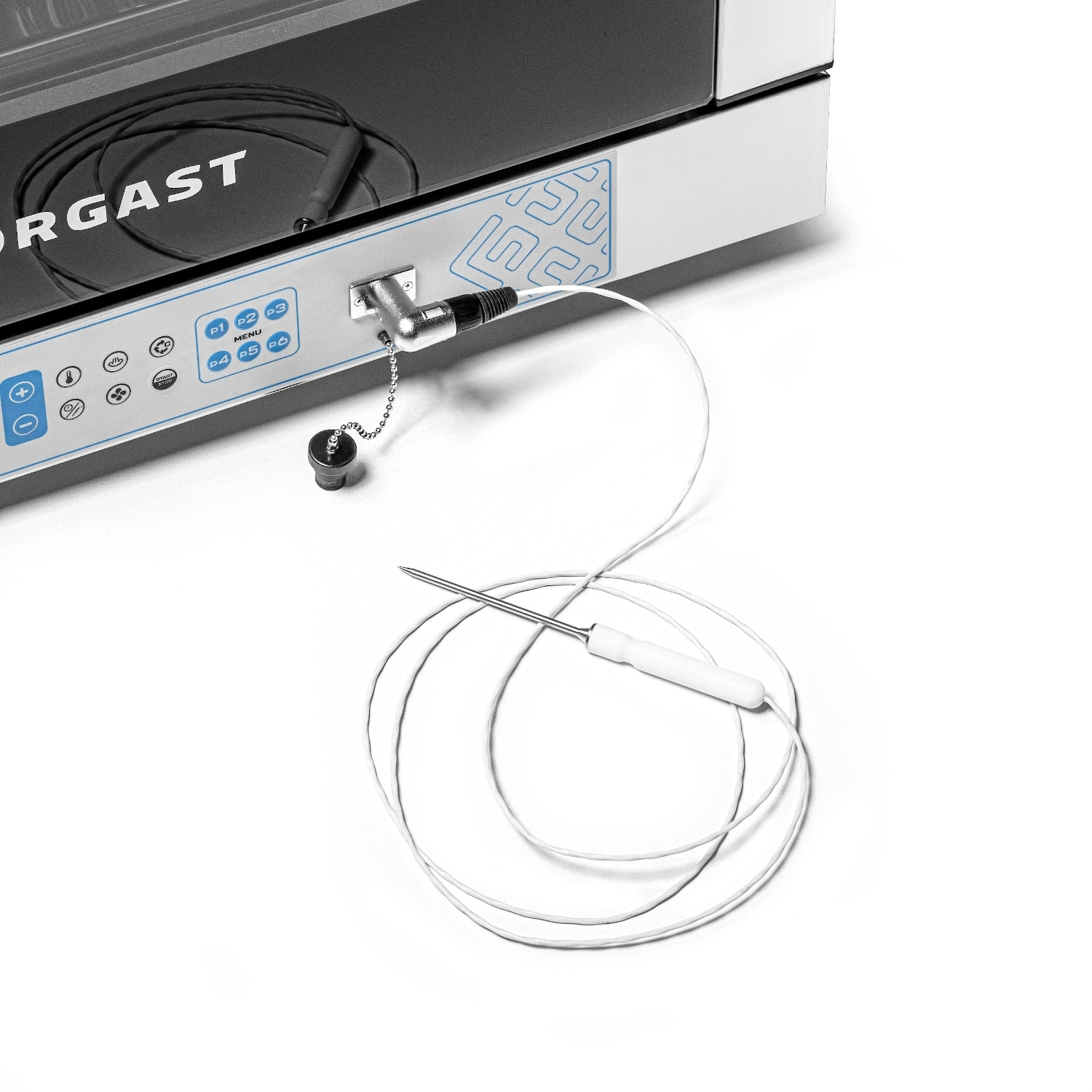 Konstrukcja pieca wykonana jest z wysokiej jakości stali nierdzewnej, co gwarantuje trwałość oraz łatwość utrzymania czystości. Przeszklone drzwi i halogenowe oświetlenie umożliwiają stałą kontrolę procesu pieczenia bez konieczności otwierania komory. Ergonomiczna klamka po prawej stronie ułatwia codzienną obsługę, a trzy wentylatory z rewersem zapewniają równomierną cyrkulację powietrza, co przekłada się na doskonałe efekty pieczenia. W zestawie znajduje się również sonda rdzeniowa do precyzyjnego monitorowania temperatury wewnątrz potrawy.