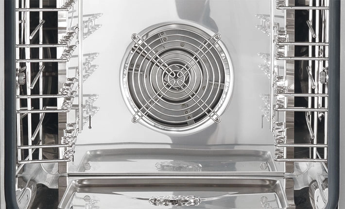 • Trzy wentylatory z pięciostopniową regulacją i autorewersem – Gwarantują doskonałą cyrkulację powietrza na wszystkich poziomach, co umożliwia równomierne pieczenie na każdej półce. Funkcja autorewersu zwiększa wydajność urządzenia podczas intensywnej pracy, na przykład podczas przygotowywania dużych ilości potraw na bankiety czy imprezy okolicznościowe.