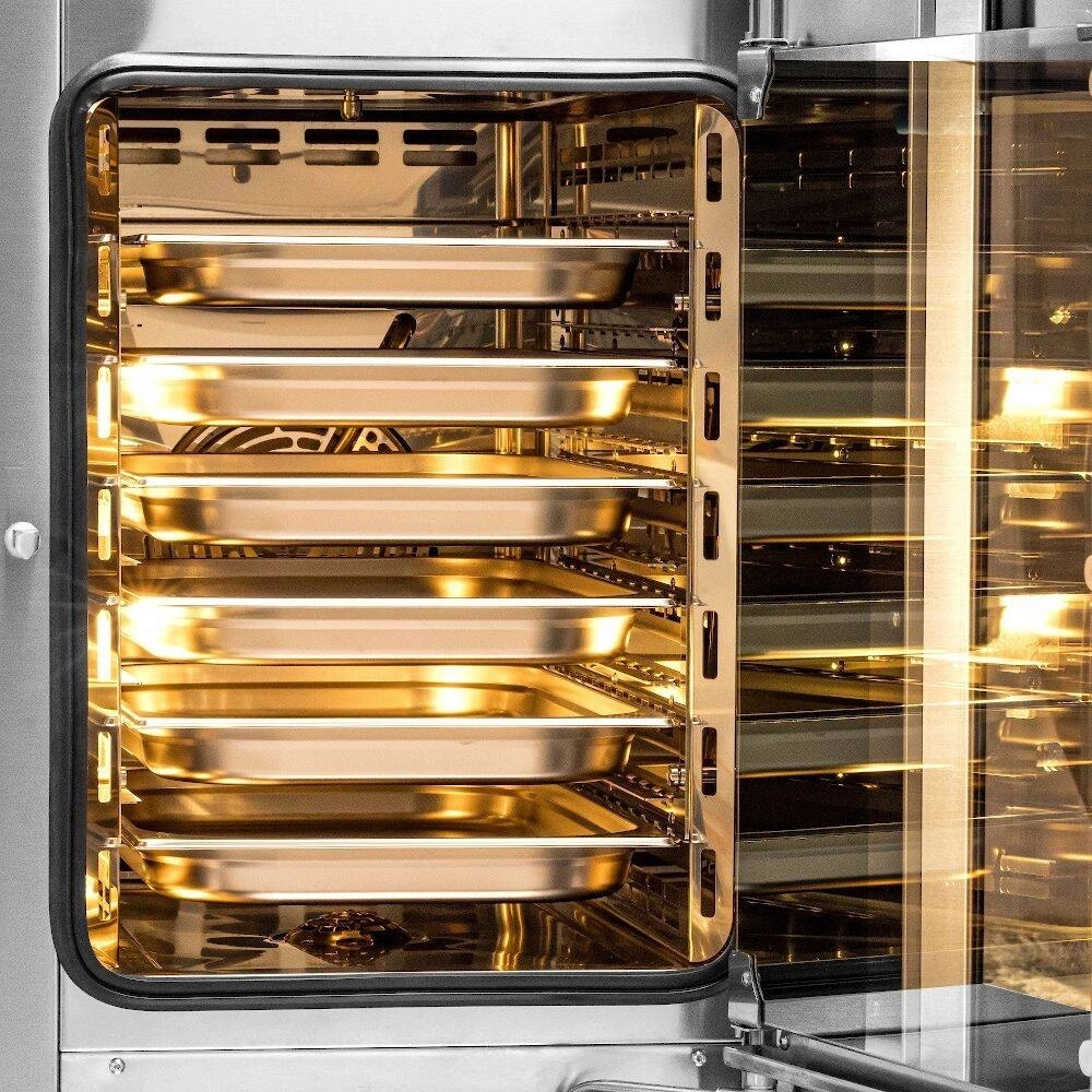Piec mieści 6 blach GN 1/1 z rozstawem prowadnic 70 mm, co umożliwia efektywne przygotowanie wielu dań jednocześnie. Zakres temperatur od 30°C do 280°C oraz tryby: konwekcja, para i mieszany – dostępne zarówno w trybie manualnym, jak i automatycznym – zapewniają ogromną swobodę kulinarną.