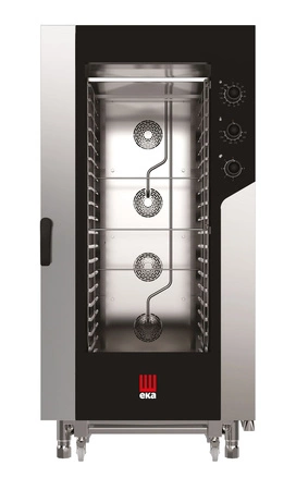 Piec konwekcyjno- parowy elektryczny Millenial Smart Gastro. Przystosowany do 20 blach GN 1/1. Posiada 3 pokrętła, które służą do: regulacji czasu w zakresie 10 do 120 minut lub pracy Non-stop, regulacji temperatury 100°C do 275°C, 5- stopniowej regulacji zaparowania komory. Podwójnie przeszklone drzwi posiadają blokadę otwarcia, która chroni obsługę przed niekontrolowanym ruchem. Uszczelka drzwi wykonana z trwałego sylikonu, łatwa do samodzielnej wymiany. Rynienka pod drzwiami. Oświetlenie LED komory. Izolowana obudowa pieca wpływa na oszczędność energii elektrycznej. Komora jak i obudowa pieca wykonana ze stali nierdzewnej. Wypoziomowanie pieca jest możliwe dzięki regulowanym nóżkom. Wymagane jest podłączenie do prądu, wody uzdatnionej oraz kanalizacji.